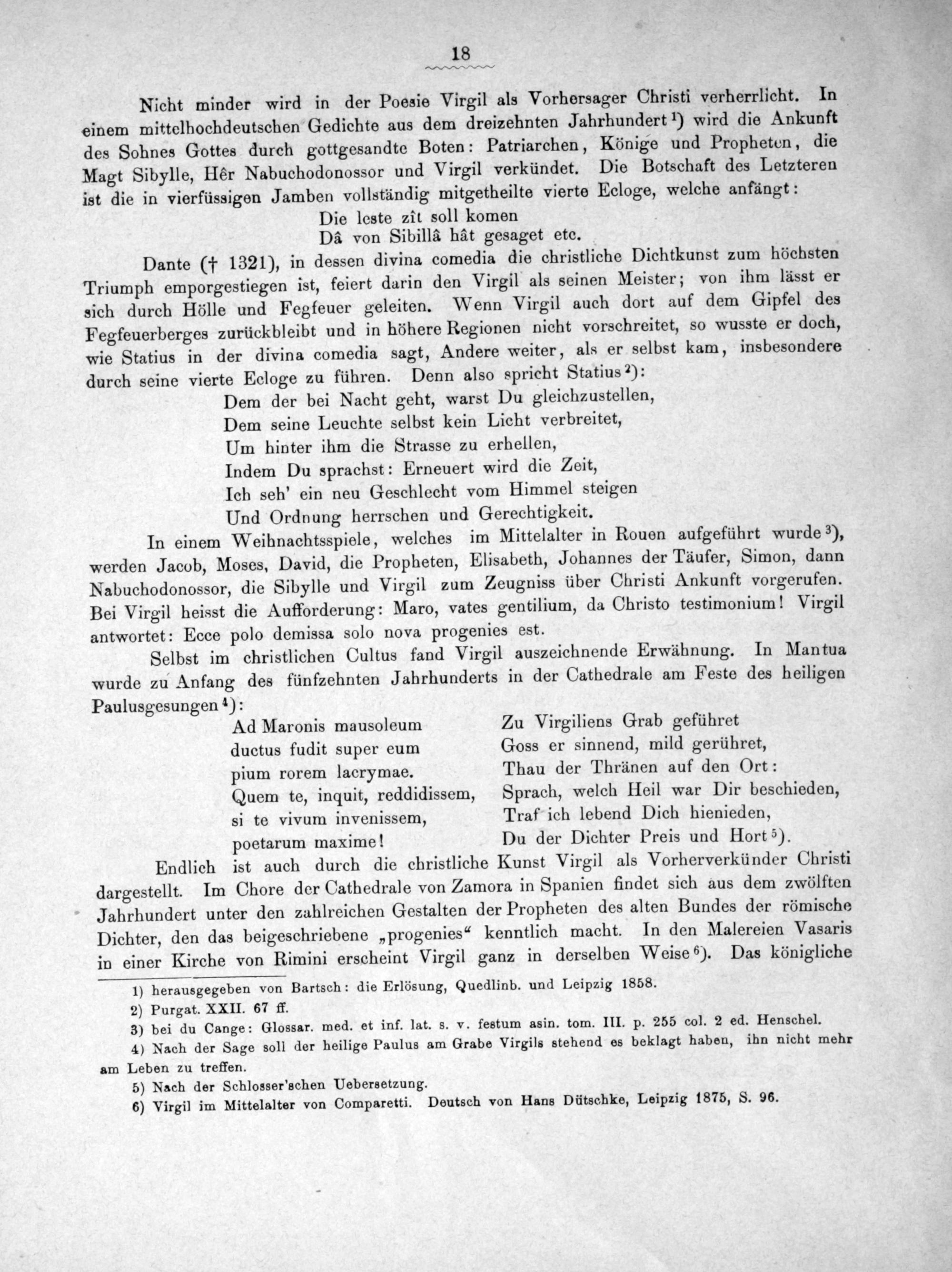 Dante(† 1321), in dessen divina comedia die christliche Dichtkunst zum höchsten Triumph emporgestiegen ist, feiert darin den Virgil als seinen Meister; von ihm lässt er sich durch Hölle und Fegfeuer geleiten. Wenn Virgil auch dort auf dem Gipfel des Fegfeuerberges zurückbleibt und in höhere Regionen nicht vorschreitet, so wusste er doch, wie Statius in der divina comedia sagt, Andere weiter, als er selbst kam, insbesondere durch seine vierte Ecloge zu führen. Denn also spricht Statius ²):