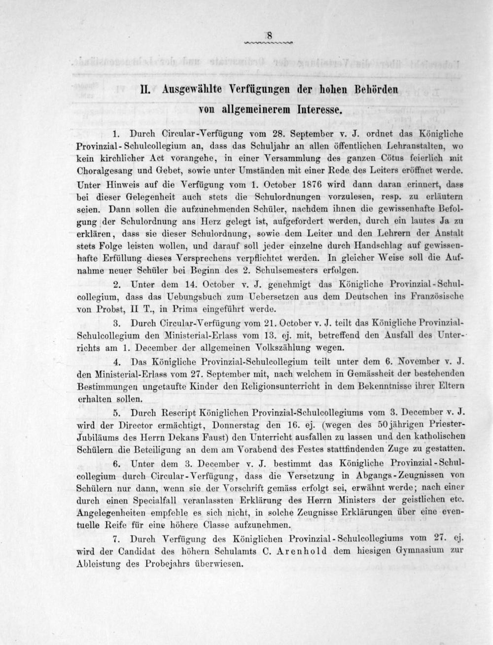 5. Durch Rescript Königlichen Provinzial-Schulcollegiums vom 3. December v. J. wird der Director ermächtigt, Donnerstag den 16. ej.(wegen des 50 jäührigen Priester- Jubiläums des Herrn Dekans Faust) den Unterricht ausfallen zu lassen und den katholischen Schülern die Beteiligung an dem am Vorabend des Festes stattfindenden Zuge zu gestatten.