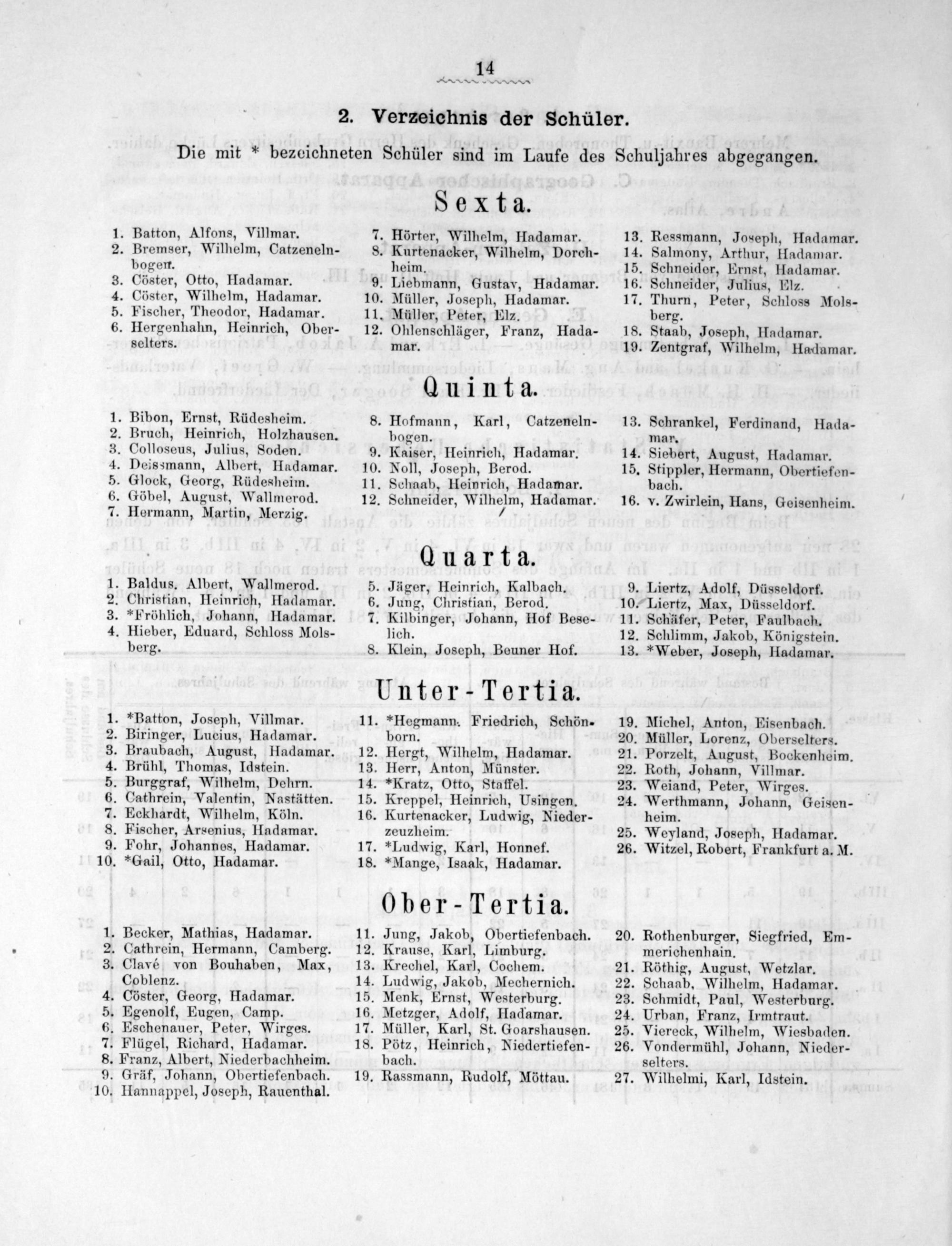 . Christian, Heinrich, Hadamar. .*Fröhlich, Johann, Hadamar. . Hieber, Eduard, Schloss Mols-