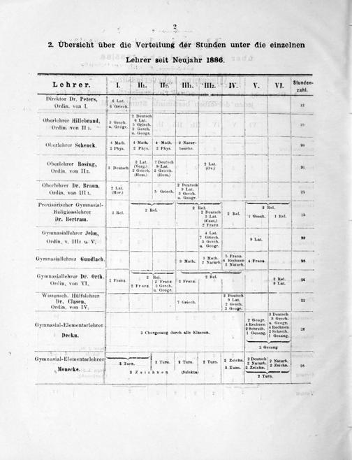 ————————— =ee e un enn fm. V ſuwen G 4 8, 31, † 4. unden- Lehrer. I. f Ih. I. IIh. IIIE. W. V. VI. Ar zahl. 2 2— Direktor Dr. Peters, 6 Lat. 4 f—— Ordin. von I. 6 Griech. 12 2 Deutsch— z 8ſſſſ Oberlehrer Hillebrand, desch.„6, Lat. 5 Griech. 19 Ordin. von II1. u. Geoge. 3 Gesch. — 3— u. Geogr. ———— 92r.——,——— 4 Nath. 4 Math 4 Nath. 2 Natur- Oberlehrer Sc 20 berlehrer Schenck. 2 Phys. 2 Phys. 2 Phys. besohr. ———— 1 2 Lat. 2 Deutsch Oberlehrer Bosing, g Deutsch(Verg) S Tat. daus 91 Ordin. von IIe. 2 Gricch. 2 Griech. 4 3 b(Hom.)(Hom.) Oberlehrer Dr. Braun, 2 1at 2 Fruach 5 4 1 2 L. at. Ordin. von III I.(Hor.)[5 Griech. 3 Gesch. 124 —— u. Geogr.— Provisorischer Gymnasial-— 4 1 2 Rel. 2 Rel. 2 Rel. Religionslehrer 2 Rel.[2 Deutsch 2 Rel. Dr. B 3 Lat ſer Gesch. 1 Rel- 19 r. Bertram.(caes.) 3 ———— 2 Frarz ——————— Gymnasiallehrer Jehn 4 1at 2 1 Griech 9 12. 28 Ordin. v. III2 u. V. 3 Geseh 4a. ſu. Geogr ———— ; 1 5 Franz. Gymnasiallehrer Gundlach.) 3 Mathl 3 Aath. ¼ Rechnen 4 Frana. 2328. 2 Na r. l 2 Naturb. 4 3—,——— Gymnasiallehrer Dr. Orth, 2 Rel 2 Rel. nhe ae Wl. b'⸗e, Wrere ush um rdm. von* 2 Franz. 3 Gesch. V 4 —[u. Geogr.—— Wissensch. Hülfslehrer 2 Deutsch Dr. Clasen. 7 Griech. 2 220 128. 22 4 Ordin. von IV. 2 Geoge 3 Deutsch 2 Geogr. 3 Gesch. V asis 5 3- 2 u. Geogr-. Gymnasial-Elementarlehrer 4 Kauhnen 4 Rechmen 22 Deckn 3 Chorgesang durch alle Klussen. 1 Gesang, ² alren. —,— Gesang 4 nnnasfal. ¹ 1— 3 2 Deutsch Gymnasial-Elementarlehrer T. 2 Turn. 2 Turn. 2 Turn. 2 Zeiehn.] 2 Nautzene Paturd. Monecke 2 Turn. 2 Zeichn. 2 Lci0 n. 26 „ de. L 2z Zeichnen Gelekta)— 2 Turn. 1 1