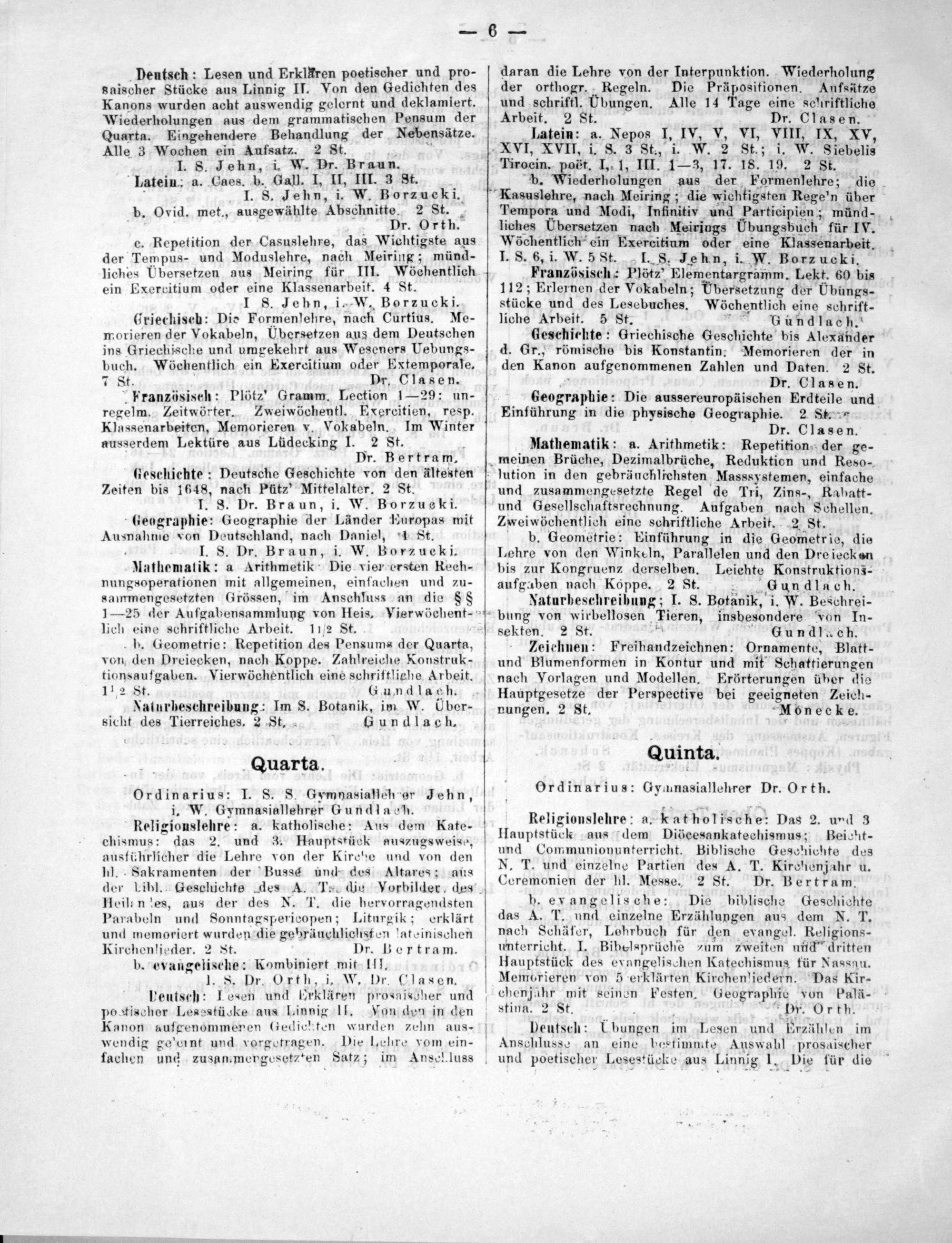 b. Geometric: Repetition des Pensums der Quarta, von den Dreiecken, nach Koppe. Zahlreiche Konstruk- tionsaufgaben. Vierwöchentlich eine schriftliche Arbeit. 1¹2 St. Gundlach.