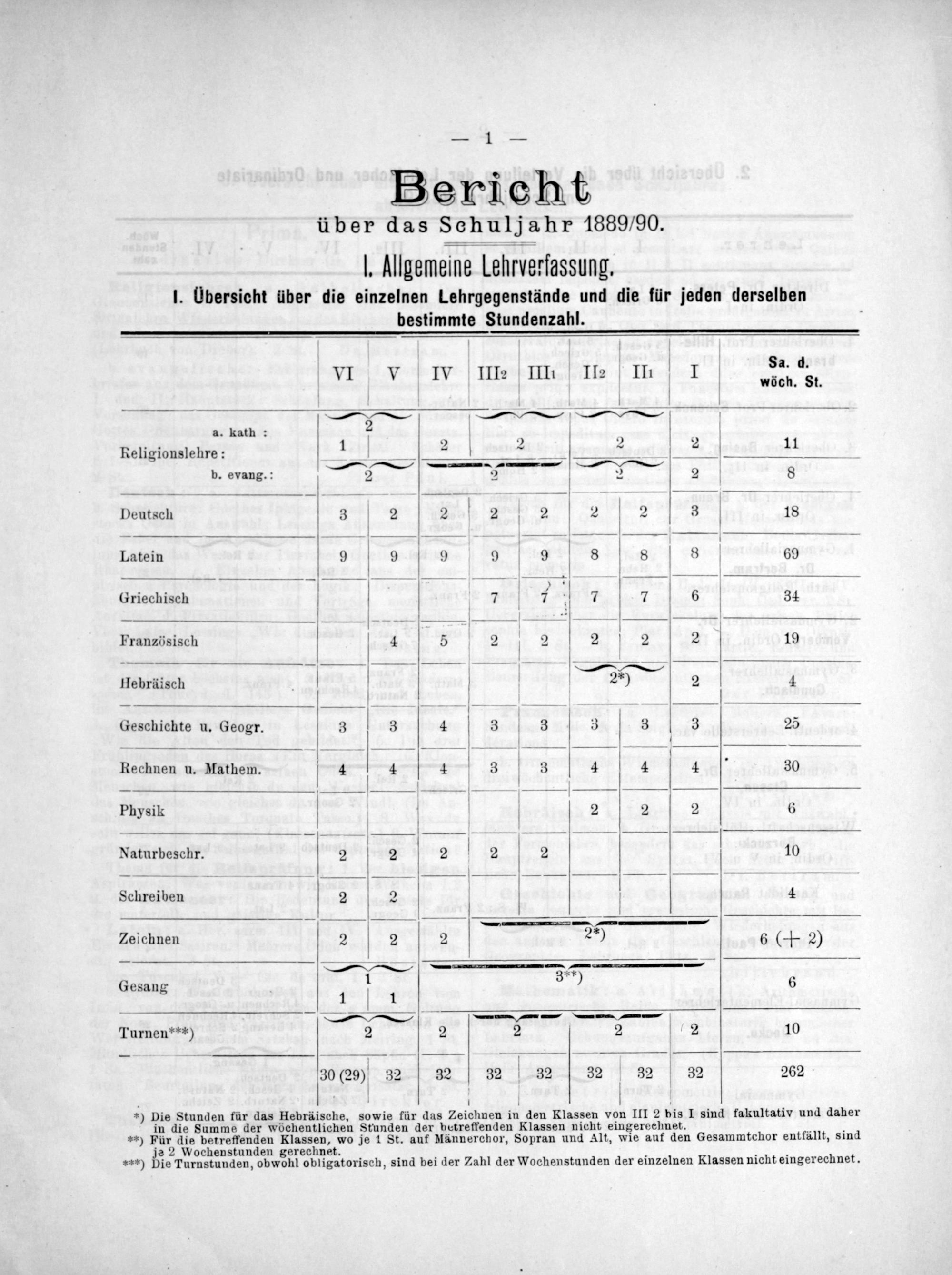vVI V IV III III IIle II 1 82. 4 V wöch. St. 5—— q f—— ſ— a. kath: 2 5 5 Religionslehre: 1. 2—— 2 23 41— b. evang.:—— 5—— 2 8 ———— Deutsch 8 2 2 2 2 2 2 3 18 ——— ————— Latein 9 9 V 9 9 9* 8 86 3 69 ————— Griechisch 7 74*7 V 7 V 6 34 ———.— 2— Französisch V 4 5 2 2 2 2 2 19 .— V— 2—— Hebräisch V 2*) 2 4 —— 134—— Geschichte u. Geogr. 3 V 3 4 3[3 3 3 3 25 —— 2..———— — Rechnen u. Mathem. 4 V 4- 3 3 4 4 V 4 30 ——— Physik 2 2 V 2 6 Naturbeschr. 2 V 2 V 2 2 2 V 10 Schreiben 2 2 V V V 4 Zeichnen 2 2 2 V 22) 6+ 2) 8—. 8 Gesang 1 827 6 1 1 ————————— Turnen***) 2 2 2 2 72 10 30(29) 32 32 32 32 32 32 32 262