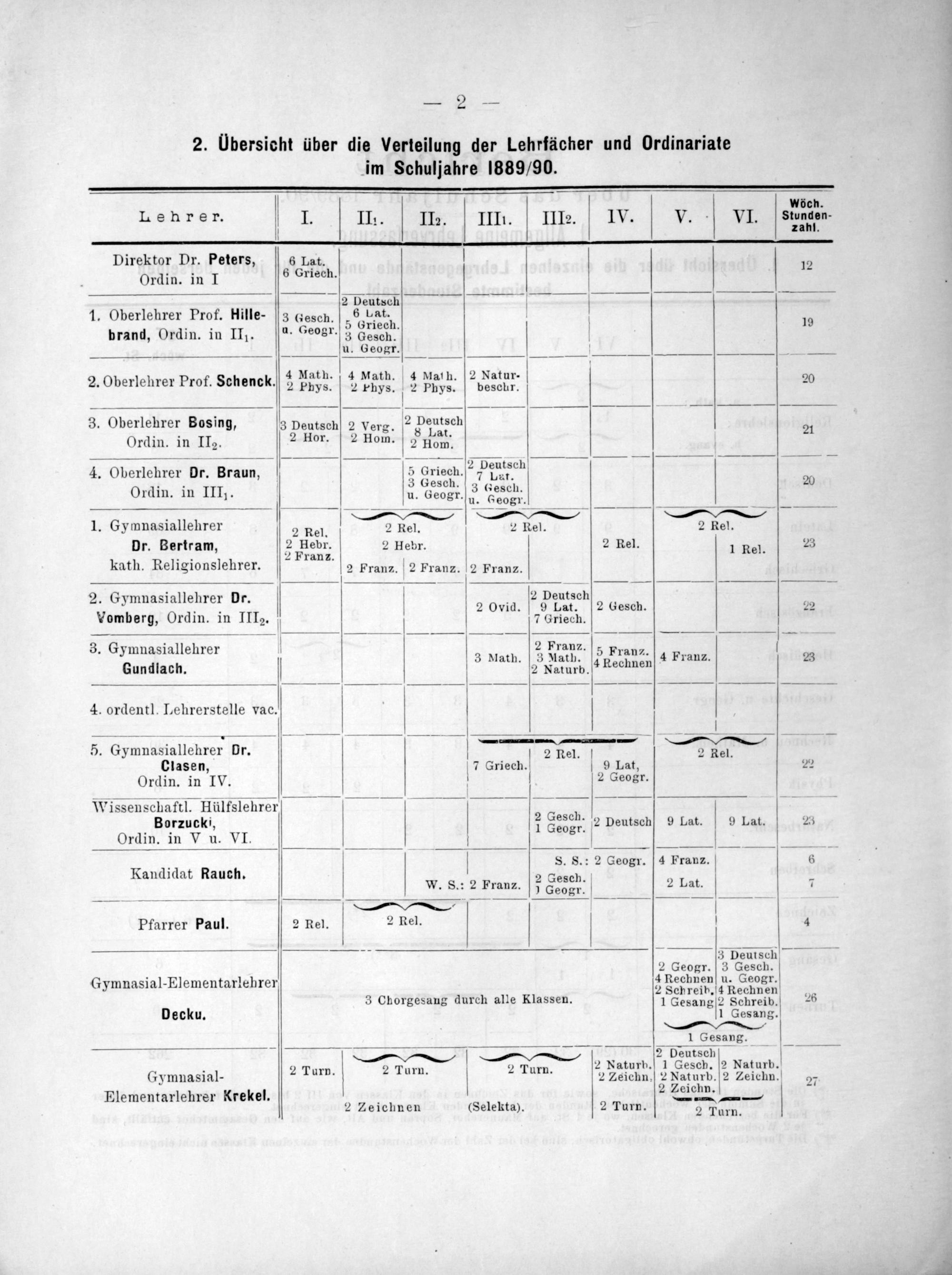wöcn. Lehrer. J. III. IIz. V IIE. III?2. IV. V. VI. Stundon. . 1 Direktor Dr. Peters, 6 Lat. 12 Ordin. in I 6 Grieeh. 1 Deutsch—— 1. Oberlehrer Prof. Hille- 3 Gesch. 56;1at⸗h 19 brand, Ordin. in III.[u. Geogr. 3 Gesch. u. Geogr. fIt.— „ 4 Math. 4 Math. 4 Math. 2 Natur- 2 2. Oberlehrer Prof. Schenck.] 2 Phys. 2 Thys. 2 puys. vesebr. 2⁰ 3. Oberlehrer Bosing, 3 Deutsch 2 Verg. ² Dautsoh 21 Ordin. in IIg. 2 Hor. 2 Hom. 2 Hom. 4. Oberlehrer Dr. Braun, 3 Griesh Pduren 25 .. desch. 3(„80. .*„3 Gesch. Ordin. in IIII. u. Geogr. u. Geugr. .———s——— 1. Gymnasiallehrer 2 Rel. 2 Rel. 2 Rel. 2 Rel. Dr. Bertram, 2 Misbr. 2 Hebr. 2 Rel. 1 Rel 23 .. 2 Franz.. kath. Religionslehrer. 2 Franz. 2 Franz. 2 Franz. 2. Gymnasiallehrer Dr. oc 2 Peutach 2 ech 2 4.. vid. at.. 2 Vomberg, Ordin, in IIIz. 7 Griech. ————— 3. Gymnasiallehrer 2 Lranz. 5 Franz Gundaen à uaen. e echnen a rue 4. ordentl. Lehrerstelle 8 V —————— 4—— 5. Gymnasiallehrer Dr. 2 Rel. 2 RKel. Clasen, 7 Griech. 9 Lat, 22 Ordin. in IV. 2 Geogr. Wissenschaftl. Hülfslehrer—*. Borzucki, 1 Seach. 2 Deutsch 9 Lat. 9 Lat. 23 Ordin. in V u. VI. 58 Kandidat Rauch S. S.: 2 Geogr. 4 Franz. 6 1 8. 9 8 W. S.: 2 Franz. 7 Gescn. 2 Lat. 7 8— Pfarrer Paul. 2 Rel. 2 Rel. 4 4 8 3 Deuisch—— 2 Geogr. 3 Gesch. Gymnasial-Elementarlehrer 4 Rerhnen dSeder. 3 Chorgesaung durch alle Klassen. 1 Gesang 2 Schreib. 26 Decku. 1 Gesang. 1 Gesang.— ——,— 1 2 Deutsch 1, 9— . 5 2 1 2 Naturb. 1 Gesch. 2 Natur Gymnasial- 2 Turn. 2 Turn. 2 Turn. 2 Zeichn. 2 Naturp. 2 Zeichn. 27 Zaond 2 Elementarlehrer Krekel. eichn. 2 Zeichnen(Selekta). 2 Turn.