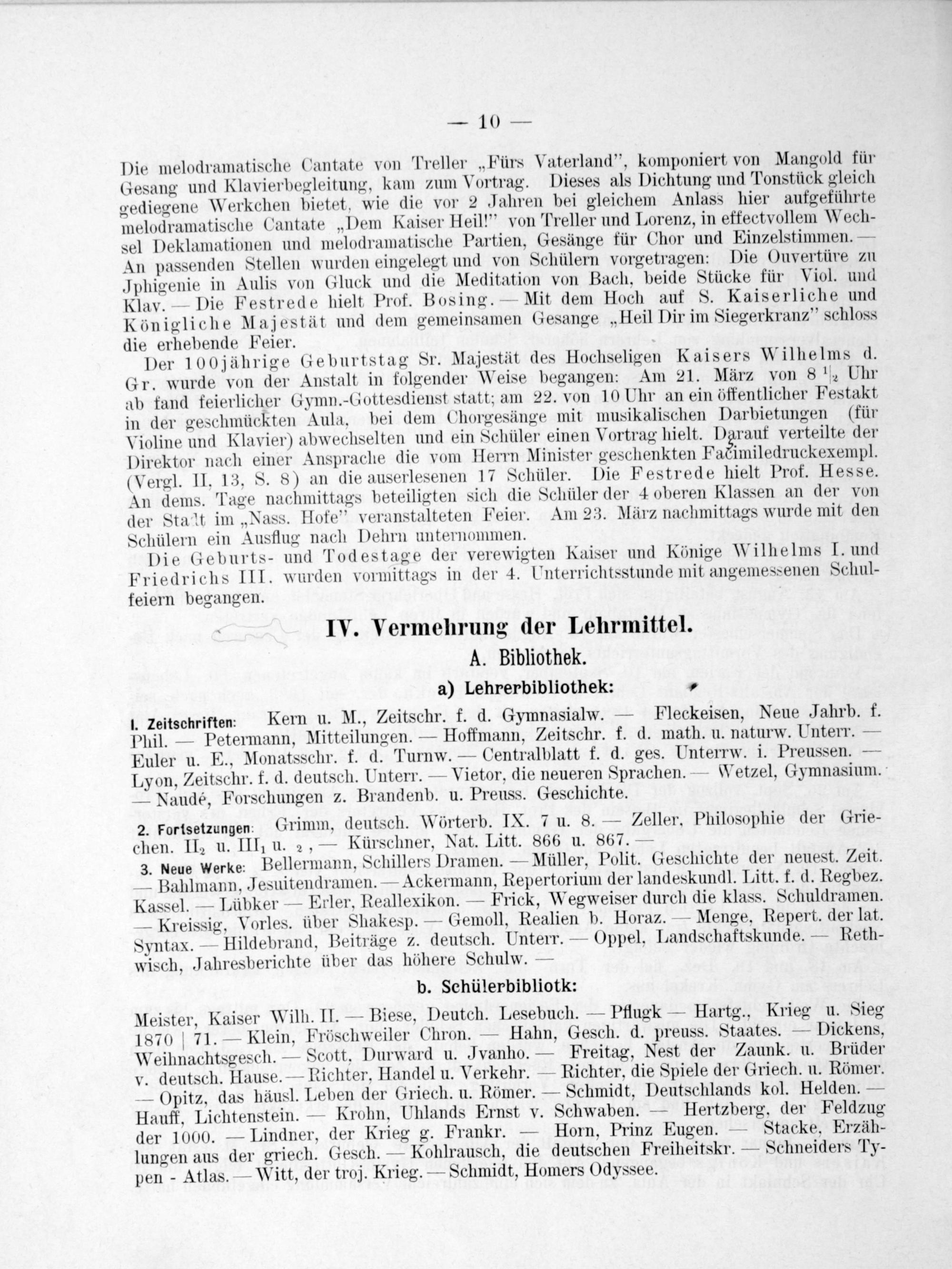 Der 100 jährige Geburtstag Sr. Majestät des Hochseligen Kaisers Wilhelms d. Gr. wurde von der Anstalt in folgender Weise begangen: Am 21. März von 8 ½ Uhr ab fand feierlicher Gymn.-Gottesdienst statt; am 22. von 10 Uhr an ein öffentlicher Festakt, in der geschmückten Aula, bei dem Chorgesänge mit musikalischen Darbietungen(für Violine und Klavier) abwechselten und ein Schüler einen Vortrag hielt. Darauf verteilte der Direktor nach einer Ansprache die vom Herrn Minister geschenkten Täiunleukeenap. (Vergl. II. 13, S. 8) an die auserlesenen 17 Schüler. Die Festrede hielt Prof. Hesse. An dems. Tage nachmittags beteiligten sich die Schüler der 4 oberen Klassen an der von der Stalt im„Nass. Hofe“ veranstalteten Feier. Am 23. März nachmittags wurde mit den Schülern ein Ausflug nach Dehrn unternommen.