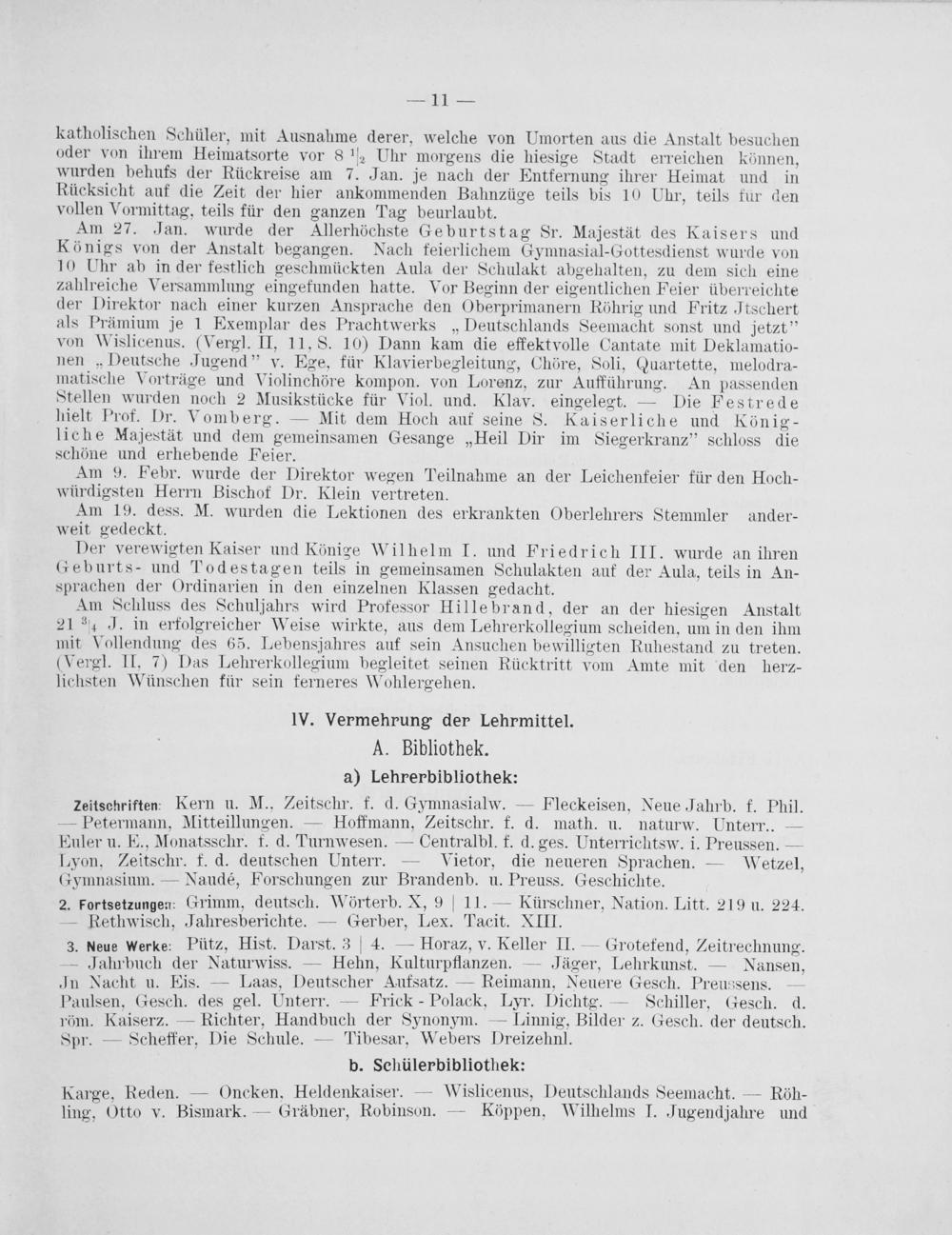 zeitschriften: Kern u. M., Zeitschr. f. d. Gymnasialw.— Fleckeisen, Neue Jahrb. f. Phil. — Petermann, Mitteillungen.— Hoffmann, Zeitschr. f. d. math. u. naturw. Unterr..— Euler u. E., Monatsschr. f. d. Turnwesen.— Centralbl. f. d. ges. Unterrichtsw. i. Preussen.— Lyon, Zeitschr. f. d. deutschen Unterr.— Vietor, die neueren Sprachen.— Wetzel, Gymnasium.— Naudé, Forschungen zur Brandenb. u. Preuss. Geschichte. 2. Fortsetzungen: Grimm, deutsch. Wörterb. X, 9 11.— Kürschner, Nation. Litt. 219 u. 224. — Rethwisch, Jahresberichte.— Gerber, Lex. Tacit. XIII.