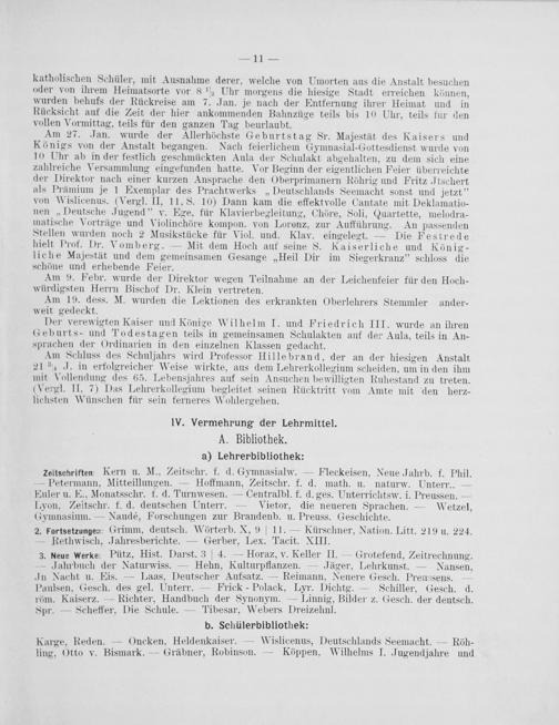 Der verewigten Kaiser und Könige Wilhelm I. und Friedrich III. wurde an ihren Geburts- und Todestagen teils in gemeinsamen Schulakten auf der Aula, teils in An- sprachen der Ordinarien in den einzelnen Klassen gedacht.