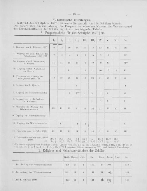 V. Statistische Mitteilungen. Während des Schuljahres 1897] 98 wurde die Anstalt von 156 Schülern besucht. Das nähere über Zu- und Abgang, die Frequenz der einzelnen Klassen, die Versetzung und das Durchschnittsalter der Schüler ergibt sich aus folgender Tabelle.