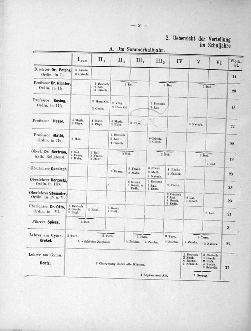 Wöch. Ilu⸗ III II? IIII IIIe IV V VI St. Direktor Dr. Peters,] 5 Latein 11 Ordin. in I. 6 Griech. ——— Professor Dr. Richter, 4 Deutsch 2 Rel. 2 Rel. 2 Rel. 25 .. at. Ordin. in III. 4 Griech. Professor Bosin 2 Hom. Od. 2 Verg. 2 Deutsch 5 7. 4 18 -Aj 2 Hom. Od. 7 Lat. Ordin. in IIII. 3 Gesch. 2 Hom 0a 5 3 4 Math. 4 Math. 4 Math. 8 2 Naturk. Professor Hiesse. 2 Phys. 2 Phys. 2 Phys. 2 Phys. Aturk 22 8. 3 3 Deutsch Professor Mathi,, 5 1. 6 Griech. .. or. 3 Ordin. in II. 4 Griech. 2 Gesch. 22 Oberl. Dr. Bertram, 2 Rel. 2 Rel. 2 Rel. 2 Rel. 2 Rel. . 2 Franz. 2 Franz. 19 kath. Religionsl. 2 Hebr. 2 Hebr. 1 Rel. 3 Franz. 3 Franz. 4 Rechn Oberlehrer Gundlach. 3 Franz. 3 Math. 3 Math. 2 Naturk. 23 — 2 Naturk. Oberlehrer Borzucki, 6 Griech. 2 Deutsch 4 1 Ordin. in III2 7 3 Gesch. u. 7 Lat. ranz. 23 . ü Erdk. 1 Erdk.. 3 Deutsch— Oberlehrer Stemmler, 7 La. 3 Lat. Ordin. in IV u. V. 2 Gesch. 1 Gesch. 23 2 Erdk. Oberlehrer Dr. 3 Deutsch. 3 Gesch. .. r. otto, 3 Gesch. 2 Engl. 1 Erdk. 8 Lat. 21 Ordin. in VI. 2 Engl. — õ OꝑQ—OBp- Q·¶·¶(···——— Pfarrer Spiess. 2 Rel. 2 — 4———— 3 Turn. 3 Turn. 3 Turn. 3 Turn. Lehrer am Gymn. 3 Turn. 1 Krekel. 2 wahlfreies Zeichnen 2 Zeichn. 2 Zeichn. 2 Zeichn. 2 Zeiehn. 2 Naturk. 27 2 Deutsch 3 Deutsch 2. 2 Erdk. 1 Gesch. Lehrer am Gymn. 1 Brne, 1 Sazcl ib. 4 Rentz. 2 Chorgesang durch alle Klassen. 2 Behrei 4 Rachn 27 .—— 1 Sopran und Alt. V 2 Gesang.
