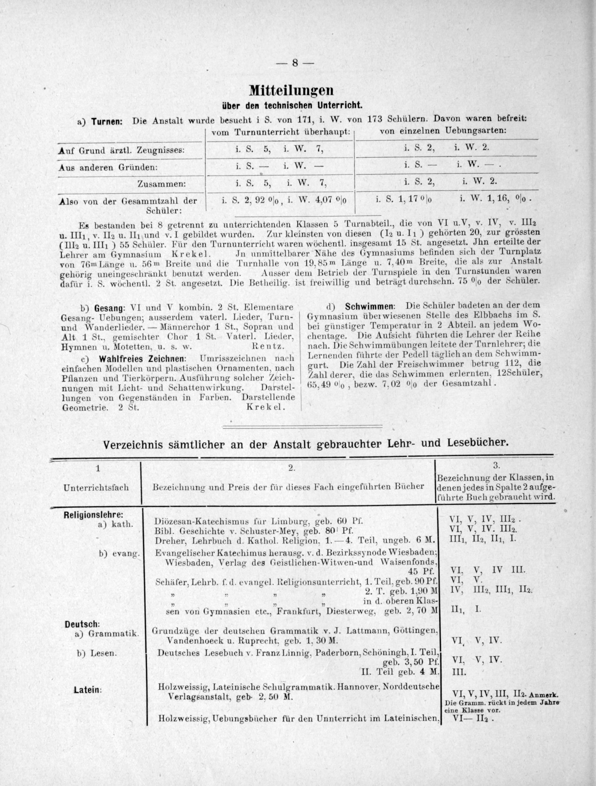 Es bestanden bei 8 getrennt zu unterrichtenden Klassen 5 Turnabteil., die von VI u.V, v. IV, v. IIIz