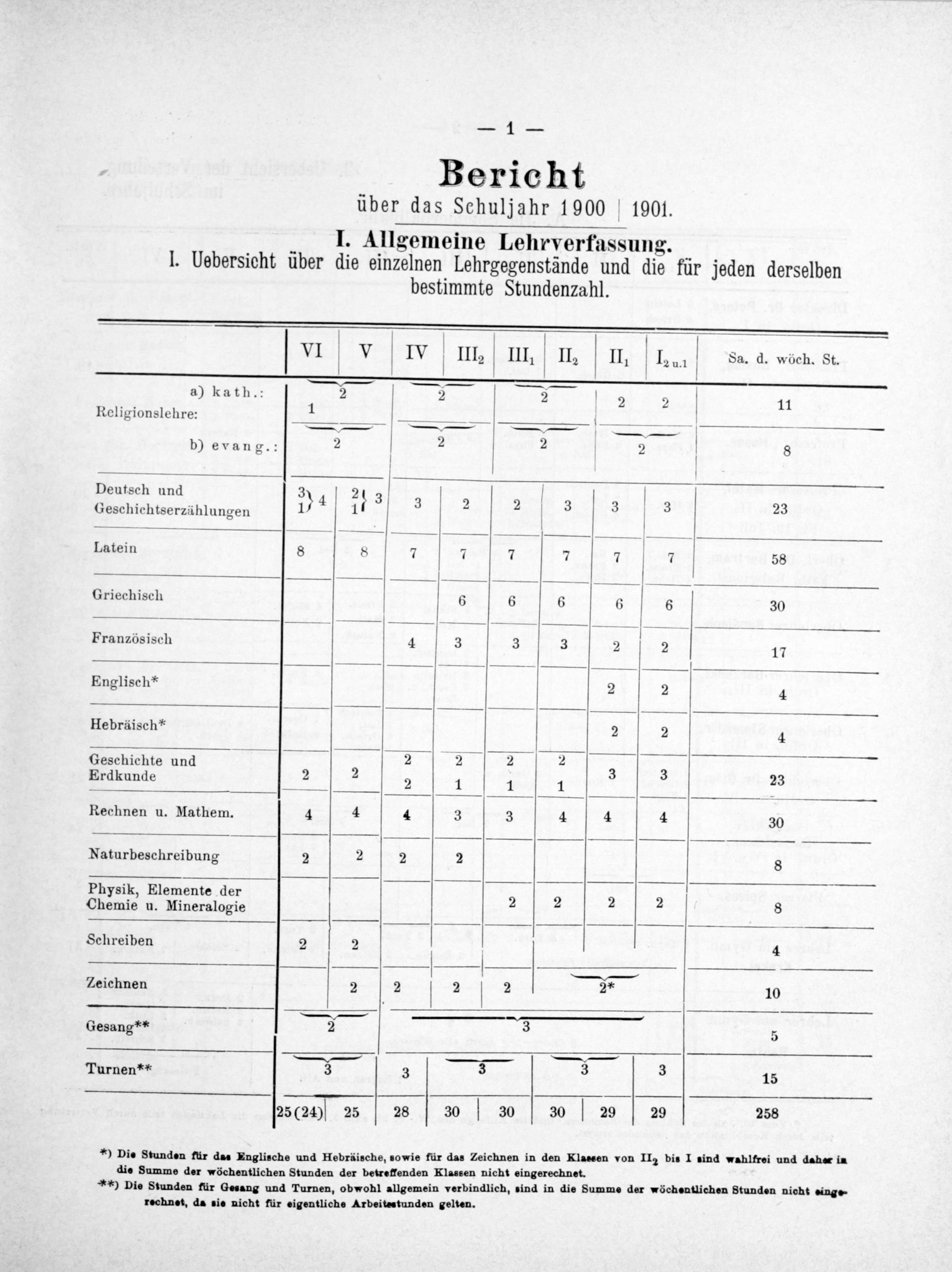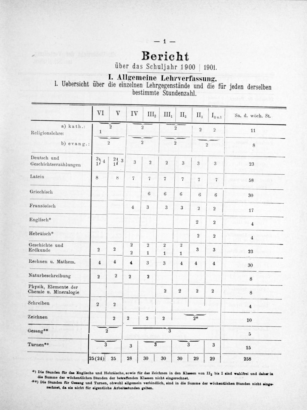 — VI V IV V III III II. II V 12 u1 V Sa. d. wöch. St. a) kath.: 2 2 2 2 2 11 Religionslehre: 2 1————— —————— b) evang.: 2 V 4 2 2 V 8 Deutsch und 3 2 V 4 3 3 2 2 3 3 23 Geschichtserzählungen 1) 1 3 —————— Latein 8 8 7 7 7 7 7 V 7 58 Griechisch 6 6 6 6 6 30 ————— Französisch 4 3 3 3 2 2 17 Englisch* 2 2 4 Hebräisch* 2 2 4 Geschichte und— 2 2 7 Erdkunde 2 2 2 1 1 1 3 3 23 Rechnen u. Mathem. 4 4 4 3 3 4 4 4 30 Naturbeschreibung 2 2 2 2 8 Physik, Elemente der 2 2 Chemie u. Mineralogie 2 2 8— Schreiben 2 2 4 —— Zeichnen 2[2 V 2 V 2 2* 10 3 Gesang** 2 5 ———,.——— Turnen** 3 V 3 V 3 3 V 3 15 25(24) 25 28 30 30 30 29 V 29 258