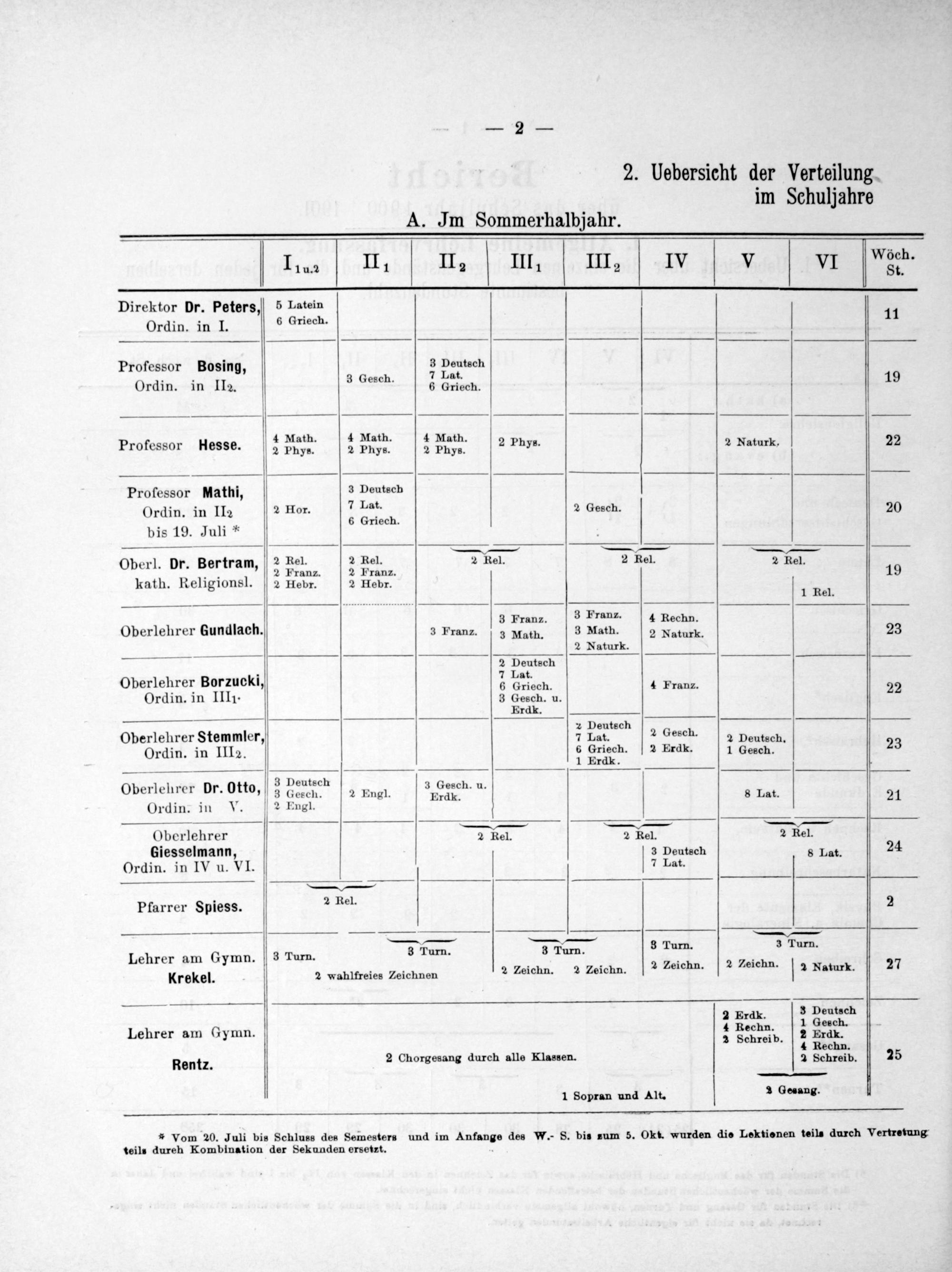 2. Uebersicht der Verteilung im Schuljahre A. Im Sommerhalbjahr.