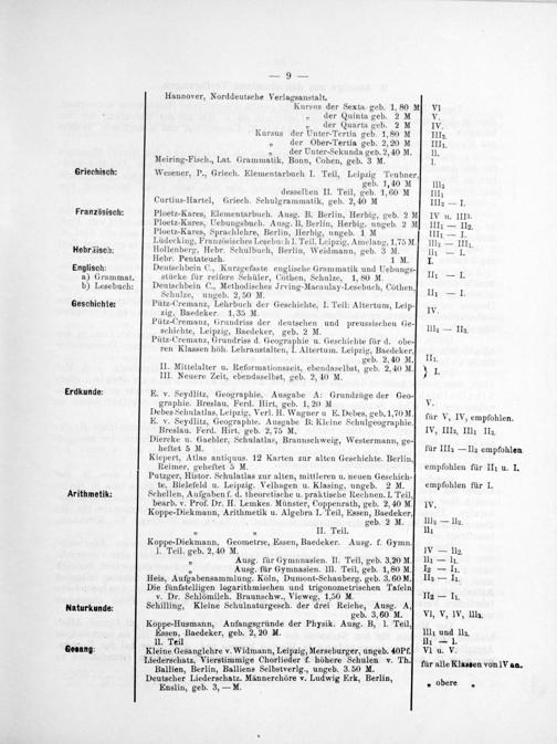 Hannover, Norddeutsche Verlagsanstalt. Kursus der Sexta geb. 1, 80 M der Quinta geb. 2 M „ der Quarta geb. 2 M Kursus der Unter-Tertia geb. 1, 80 M der Ober-Tertia geb. 2, 20 M „ der Unter-Sekunda geb. 2, 40 M. Meiring-Fisch., Lat. Grammatik, Bonn, Cohen, geb. 3 M. Wesener, P., Griech. Elementarbuch I. Teil, Leipzig Teubner, geb. 1,40 M desselben II. Teil, geb. 1, 60 M Griech. Schulgrammatik, geb. 2, 40 M
