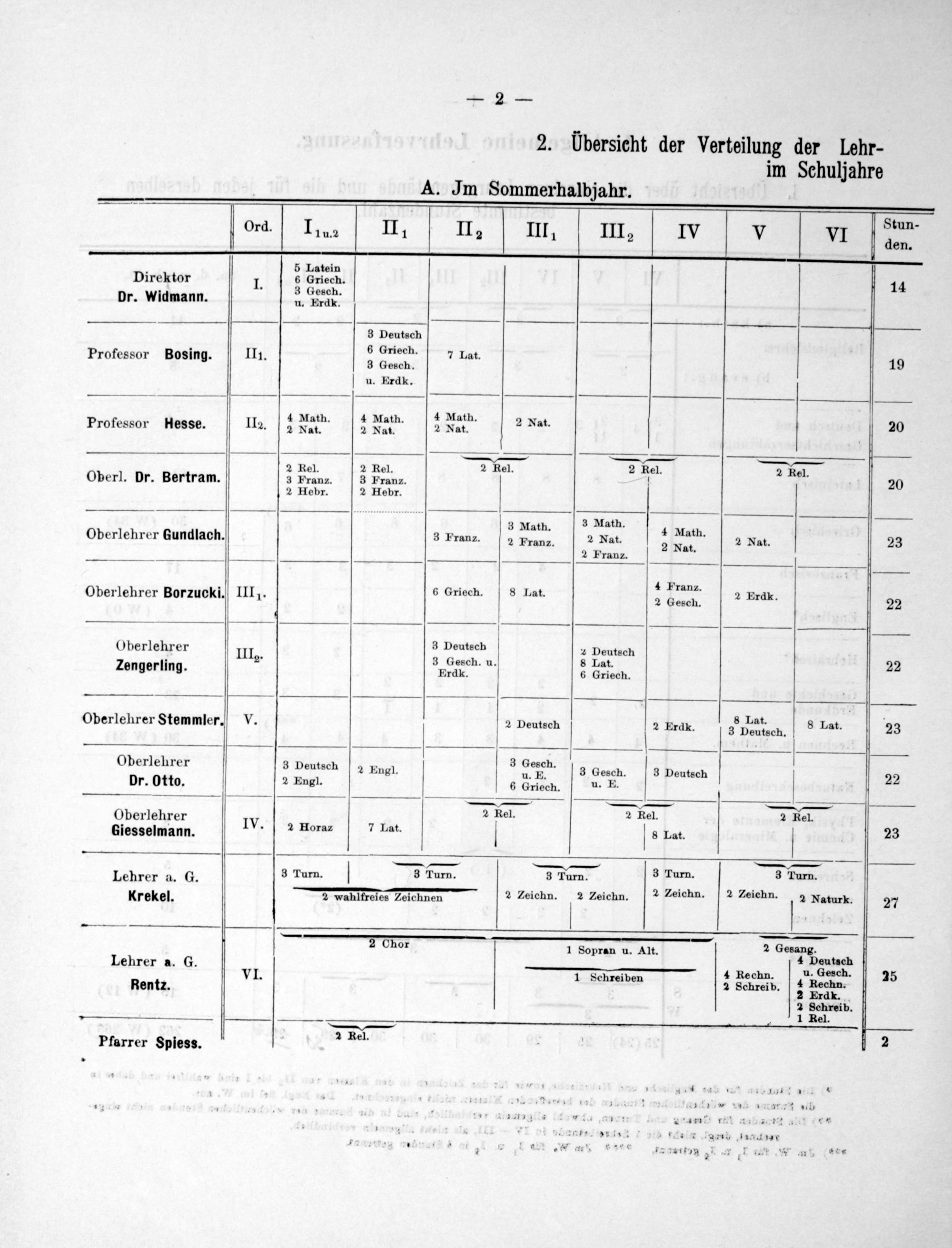 2. Übersicht der Verteilung der Lehr- im Schuljahre A. Im Sommerhalbjahr.