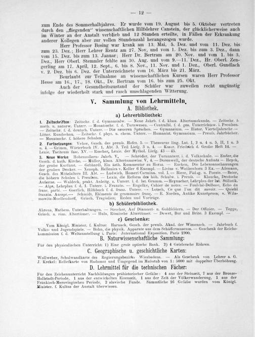 — Monatsschr. f. höhere Schulen. 2. Fortsetzungen: Vehse, Gesch. des preuſs. Hofes. 5.— Thesaurus ling. Lat. I, 2 u. 4 u. 5, II, 1 u. 3 u. 4.— Grimm, Wörterbuch IV. 1. Abt. 3. Teil Liefg. 3 u. 4.— Koser. Friedrich d. Groſse Heft 14.— Lexic. Taciteum fasc. XV.— Roscher, Lexic. der Mythol. Liefg. 43— 45. 3. Neue Werke: Hohenzollern- Jahrb. V.— Schröder, der Turnunterr. i. d. Volkschule.— Ender, die Gesch. d. kath. Kirche.— Müller, klass. Altertumswiss. V, 4.— Dorenwell, der deutsche Aufsatz— Heyck, der groſse Kurfürst.— Gebhardi, Ein ästh. Kommentar zu Horaz.— Eucken, Die Lebensanschauungen der grolsen Denker.— Xenoph. Hellenica v. Keller 6 Exempl.— Livius v. Weilsenborn 3 Ex.— Aſsmann, Gesch. des Mittelalters III. Abt.— Ludwich, Homeri Carmina. vol. I.— Biese, Pädag. u. Poesie.— Beier, die höhern Schulen i. Preufsen. Lexis, die Reform des höh. Schulw. i. Preufs.— Klaucke, Deutsche Aufsätze.— Waldeck, prakt. Anleitg. z. Unterr. i. d. lat. Gramm.— Heynacher, Lehrplan der lat. Stilistik. — Alge, Lehrplan f. d. 1. Unterr. i. Französ.— Engelke, Cahier de notes.— Foulchè-Delbosc, Echo du franc. parlé.— Goerlich, Hilfsbuch f. d. franz. Unterr.— Lotsch, Ce que l'on dit savoir.— Quiehl Schmidt, Eléments de grammaire franç. E. Norden, Antike Kunstprosa; v. Wila-