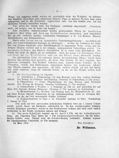 10. Das neue Schuljahr beginnt am 20. April 8 Uhr mit der Aufnahmeprü- fung. Am folgenden Tage findet um 7 Uhr Gymnasialgottesdienst für die katho- lischen Schüler statt. Darauf wird die Schulordnung verkündet. Alsdann beginnt der lehrplanmäfsige Unterricht.(S8 Uhr morgens)