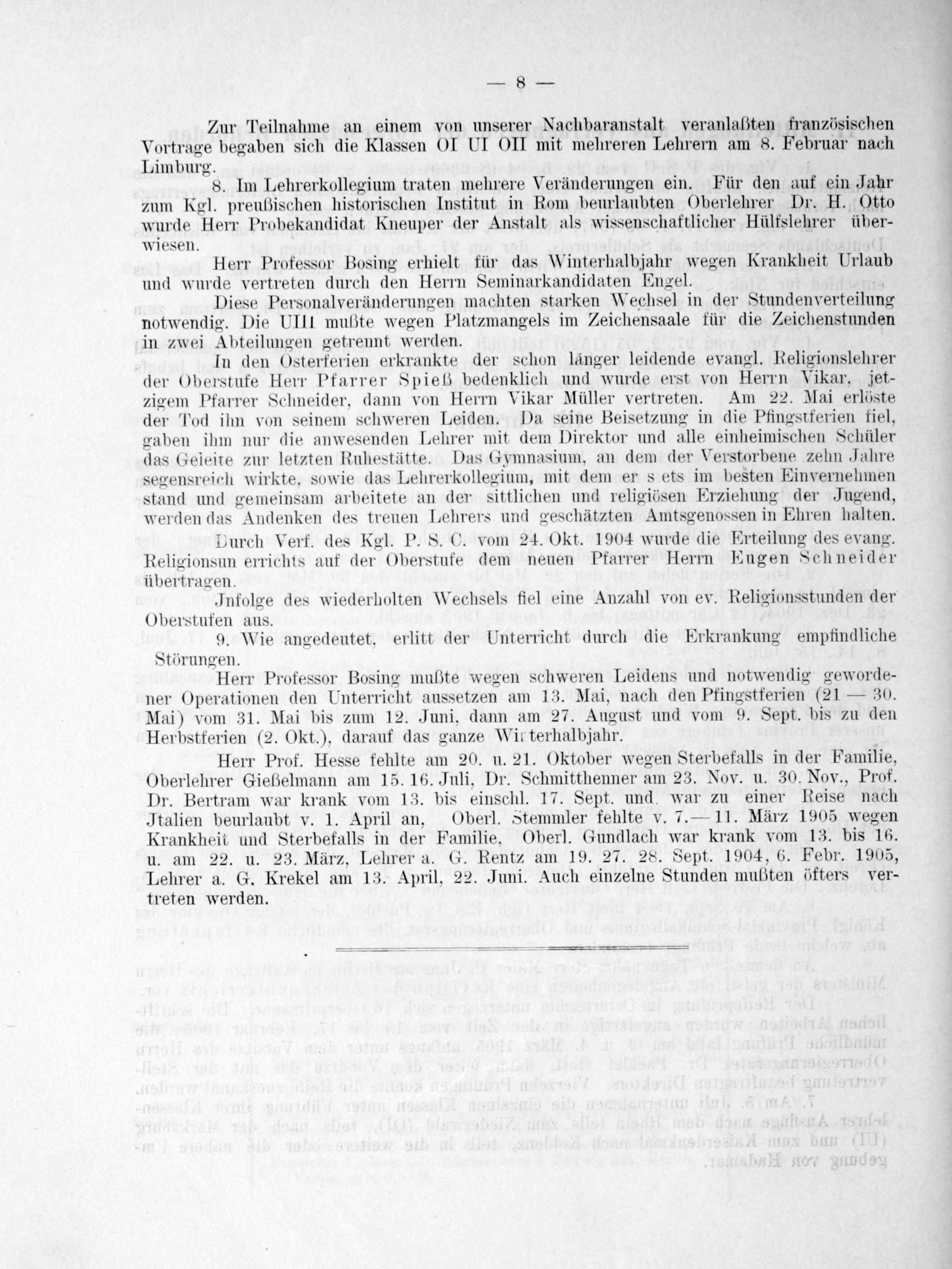 8. Im Lehrerkollegium traten mehrere Veränderungen ein. Für den auf ein Jahr zum Kgl. preußischen historischen Institut in Rom beurlaubten Oberlehrer Dr. H. Otto wurde Herr Probekandidat Kneuper der Anstalt als wissenschaftlicher Hülfslehrer über- wiesen.
