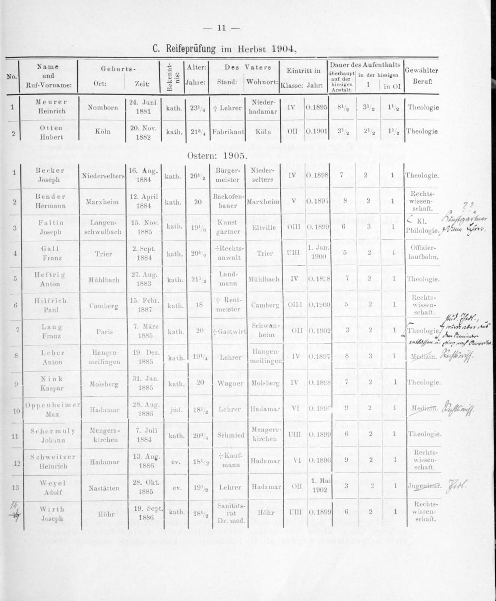 Name 3— gr. 4 1 Dauer des Aufenthalts Geburts- S. Alter: Des J aters Eintritt in 6 Gewählter No. und S 34. Lderbaadt in der hiesigen Ruf-Vorname: Ort: Zeit: ahre: Stand: Wohnort: Klasse: Jahr: hiesigen I in Ol Beruf. — Anstalt: 1n Meurer. 24. Juni Nieder-.. 1 Heinrich Nomborn 1881 kath. 23 ½¼ † Lehrer hadamar IV O. 18955 8 ½l 3 ½ 11 ½ Theologie Otten 3 20. Nov. 3 8. 72 31 91 1 m. 2 Hubert Köln 1832 kath. 21 ¾ Fabrikantt Köln OII 019 1901] 3 ½ 2 ½ 1 ½ Theologie Ostern: 1905. 1 Becker. 16. Aug. Bürger- Nieder-. 1 Niederselters 2 Ka 1½. 0.1898 7 2 Theologi Joseph Niederselte 1884 kath.] 20 ½ meister selters n 1 4 1 Theologie. Bender 4 12. April. Backofen- 3.— 5 Rechts- 2 Hermann Marxheim 1884 kath. 20 bauer Marxheim V O. 1897 8 2 1 wissen- 5 90 auer schaft. 3 2 Faltin Langen- 15. Nov. kath 9 Kunst OII 0.189 1 Kl. 4 Vehe Kkath. Altville). 1899 3 5 Joseph schwalbach 1885 18 ⅓ gärtner Eltville 4 Philologie.* Llua⸗ Sr. Gall 2. Sept †Rechts- 1. Jan. Offizier- 4 3 Trier 8 20% Trier UIII 5 2 Franz Prien 1884 kath. 2 anwalt Priel 1900 8 laufbahn. „ Heftrig 27. Aug 3. Land- 3.„ 1. 2 Anton Mühlbach 1888 kath.] 21 ½6]/ mmann[Nühlbach] IV 0. iscs 7 2 1 Theologie. 3 Hilfrich 15. Febr. 18* Rent- lII O 10 5 Rechts- 6 Paul Camberg 1887 kath. d meistor Camberg01 0.1900 5 2 W 806 4 Schalt. 4 1 1— J, e,ee „ Lang 4 7. März. Schwan-. a⁴en, 7 baris a 20 † Gastwir.) O. 1902 3 2 heologie Fran⸗ Pari 1885 kath. Gastwirt heim OII O. 1902 1 rheo ie e/. Hee⸗ —— nuihte ner eR= 3 1 angen- 0* Hlangen-— 2& 7 8 Leber Hangen 19. Dez. 191 e 9 1 n 8 2 ,, Hihn Anton meilingen 1885 kath. 19 74 Pebrer meilingen 0.1895 3 Medigin.- 2eniſ Nink 31. Jan..„ 9 Kaspar Molsberg 1883 kath. 20 Wagner Molsberg 1V O0. 1898 7 2 1 Theologie. Kaspar d 885 5 Oppenheimer 28. Au 7 10 Ppe M 6 Hadamal 1886 jüd. 18 ½¼ Lehrer[Hadamar VI(O. 18* 9 2 1 Mediztfl. er Ma9n-8 7 Schermuly Mengers- Juli Mengers- 4 8 56 3 Sec je J 0,.1899 6 2 1 Theologie. 11 Johann kirchen 1884 kath.] 20%¾ chmied kirchen UIII 1 eologie —— 1 e unr Rechts- Schweitzer 13. Aug. † Kauf- 6 6 ad: ar V adamar N O0.1896 9 2 1 WIssen- 12 Heinrich Hadamar 1886 ev. 18¹2 mann Hadamar 1 189 velsen Weyel 28. Okt. 1. Mai.—. 13 Laut Nastätten 1885 ev. 19 ½ Lehrer Hadamar OII 1902 3 2 1 Ingeniedr. O 7 4 0 8d 902— ME. 1 9. Se 8 aniti its- Rechts- 3 Wirth Höhr 19. Sept.] kath.] 18 ¼ rat Höhr VUIII 0. 1899 6 2 1 wissen- Joseph 1886 Dr. med. schaft.