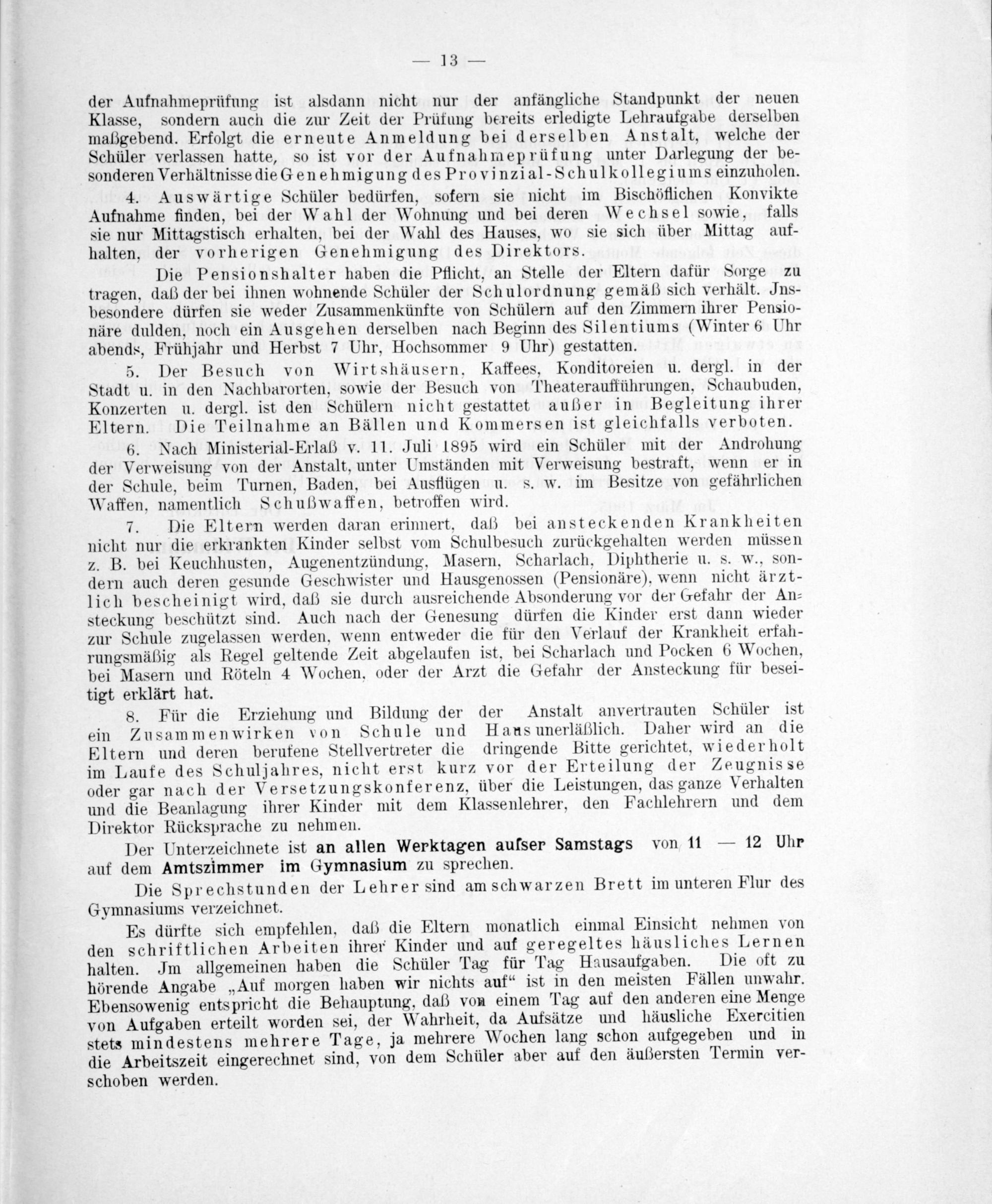 4. Auswärtige Schüler bedürfen, sofern sie nicht im Bischöflichen Konvikte Aufnahme finden, bei der Wahl der Wohnung und bei deren Wechsel sowie, falls sie nur Mittagstisch erhalten, bei der Wahl des Hauses, wo sie sich über Mittag auf- halten, der vorherigen Genehmigung des Direktors.