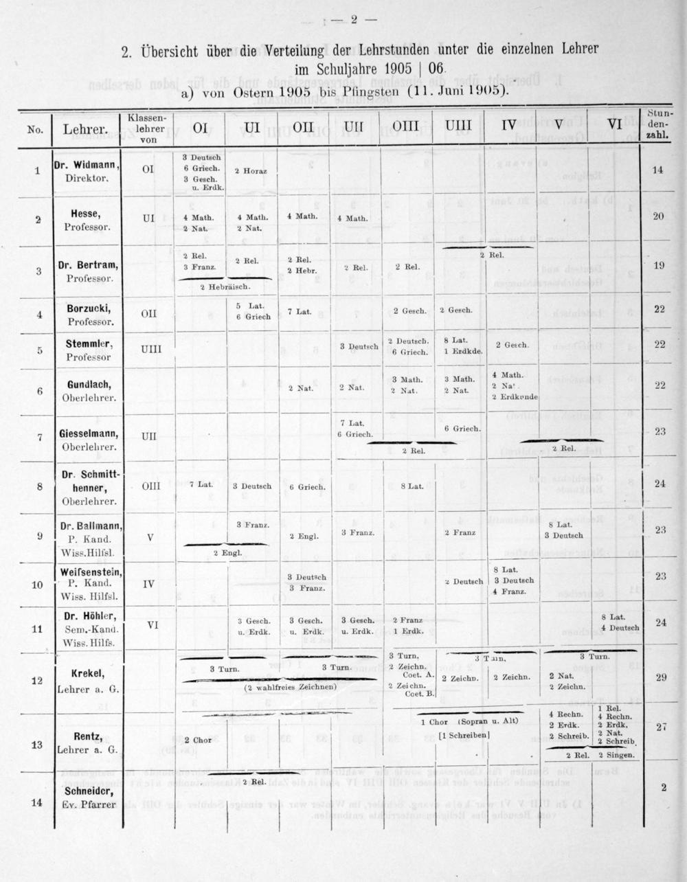a) von Ostern 1905 bis Pfingsten(11. Juni 1905). 8 EEſſnſn Klassen- Stun- No. Lehrer. lehrer 01 UI OII V Ull OIII UIII IV V VI den- von zahl. 2 3 Deutsch 1 ſor. Wiamann, 01 V 6 Griech. 2 Horu- Direktor. 3 Gesch. 14 . Erdk 3„ſͤſ““ͤͤͤ 2 Hesse, UI V 4 Math 4 Math. 4 Math. 4 Math I 20 Professor. 2 Nat. 2 Nat. I —— 5———— 4— 2 Rel 2 2. 2 Rel.. 3[Dr. Bertram, a Franz 2 e 2 Rai. 2 Rel. 2 RAdl.. 19 Professor.— 2 Hebräisch. ———————-—— Borzucki 5 Lat. 6 1, V 4 Professor OII 6 Griech 7 Lat. 2 Gesch. 2 Gesch. 3 V 22 r——————— Stemmler V 2 Peutsch.(s Lat. 5 2 3 Deuts ch. 5 Professor UIII 1 eutsch 6 Griech. I 1 Erdkde. 2 Gereh 22 ——————QCQCQC—C——— —————,—— 4 Math. 3 Math. 3 Math. 6(unaoh. V 2 Nat 2 Nat 2 Nat. V 2 Ra 2 Nat 22² berlehrer. 2 Erdkunde V —————·:——————— 1 7 Tat. 7 ſoiesselmann, UII(s Griech. 6 Grisch. 23 Oberlehrer.———— — 2 Rel. 2 Rel. Dr. Schmitt- V V 8 henner, OIII 7 Lat 3 Deutsch 6 Griech. 8 Lat. b 24 Oberlehrer. I /QQ¶·ʒvyͤqʒqſ——⏑——————Q——— ,——— Dr. Ballmann, 3 Franz arae 9 P. kand V 2 Engl 3 Franz. 2 Franz 4 23 . Kand. bngl. 3 Deutsch Wiss. Hilſsl. 2 Engl. V Weiſsenstein, a Detoch 8 Lat. 10 P. Kand. IV 3 Vr v ² Deutach 3 Deutch 23 Wiss. Hilfsl. Tkens. 4 Pran⸗. Dr. Köhler, V 3 Gesch. 3 Gesch. 3 Gesch. 2 F V 8 Lat VI 3 sC esch. esch. ranz at. 11 Sem.-Kand. u. Erdk u. Erdk. u. Erdk. 1 Erdk. V 4 Deutsch] 24 Wiss. Hilfs. V — V.—— 3 Turn. amm 3 Turn 3 Turn. Turn. 2 Zeichn. 12 Krekeſ, Coet. A.] 2 zeichn. 2 Zeichn. 2 Nat. V 29 Lehrer a. G.(2 wahlfreies Zeichnen) 2 Lehahn. 2 Zeichn. —C—C—CQC——————— ——————————— 1 Rel. —— Rechn. 1 Chor(Sopran u. Alt). Pouh 4 Rochn. 27 13 Rentz, 2 Cnor[1 Schreiben! 2 Schreib. 2 Nat. 4 Lehrer a. G.— 2ZBehreib. 8 2 Rel. 2 Singen. ————— 4 „ 2 Rel. V Schneider, 2 14 Ev. Pfarrer