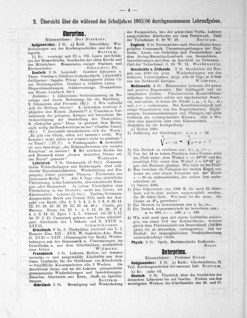 Klassenlehrer: Professor Hesse. Religionslehre: 2 St. a) Kath.: Glaubenslehre, II. Teil; Kirchengeschichte der neueren Zeit. Bertram. b) Ev. siehe OI. Deutsch: 3 St. Überblick über die Geschichte der deutschen Litteratur bis auf Goethe. Proben aus den wichtigsten Werken der Schriftsteller des 16. und 17.