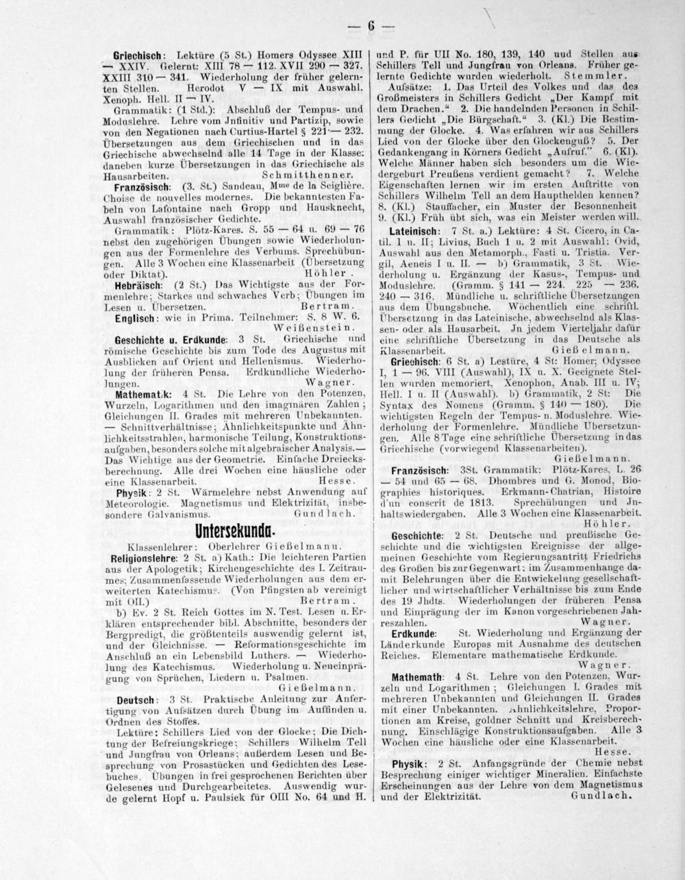 menlehre; Starkes und schwaches Verb; Ubungen im Lesen u. Ubersetzen. Bertram. Englisch: wie in Prima. Teilnehmer: S. 8 W. 6. Weißenstein. Geschichte u. Erdkunde: 3 St. Griechische und römische Geschichte bis zum Tode des Augustus mit Ausblicken auf Orient und Hellenismus. Wiederho- lung der früheren Pensa. Erdkundliche Wiederho- lungen. Wagner. Mathematk: 4 St. Die Lehre von den Potenzen, Wurzeln, Logarithmen und den imaginären Zahlen; Gleichungen II. Grades mit mehreren Unbekannten. — Schnittverhältnisse; Ahnlichkeitspunkte und Ahn- lichkeitsstrahlen, harmonische Teilung, Konstruktions- auſgaben, besonderssolche mit algebraischer Analysis.— Das Wichtige aus der Geometrie. Einfache Dreiecks- berechnung. Alle drei Wochen eine häusliche oder eine Klassenarbeit. Hesse. Physik: 2 St. Meteorologie. Magnetismus und Elektriziftät, insbe- sondere Galvanismus. Gundlach.