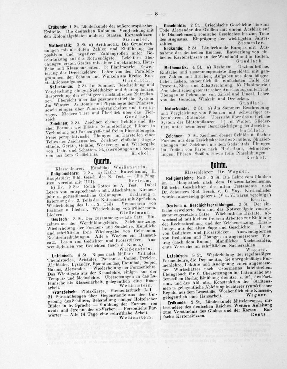 Lateinisch: 8 St. Wiederholung der regelmäßigen Formenlehre, die Deponentia, die unregelmäßige For- menlehre, Lektüre und Aneignung eines angemesse- nen Wortschatzes nach Ostermanns lateinischem Übungsbuch für V: Ubersetzungen ins Lateinische aus demsélben Buche; Einübung des Acc. c. inf., des Part. coni. und des Abl. abs., Konstruktion der Städtena- men u. gelegentliche Ableitung leichterer syntaktischer Regeln aus dem Lesestoffe. Wöchentlich eine Klassen-, gelegentlich eine Hausarbeit. Wagner.