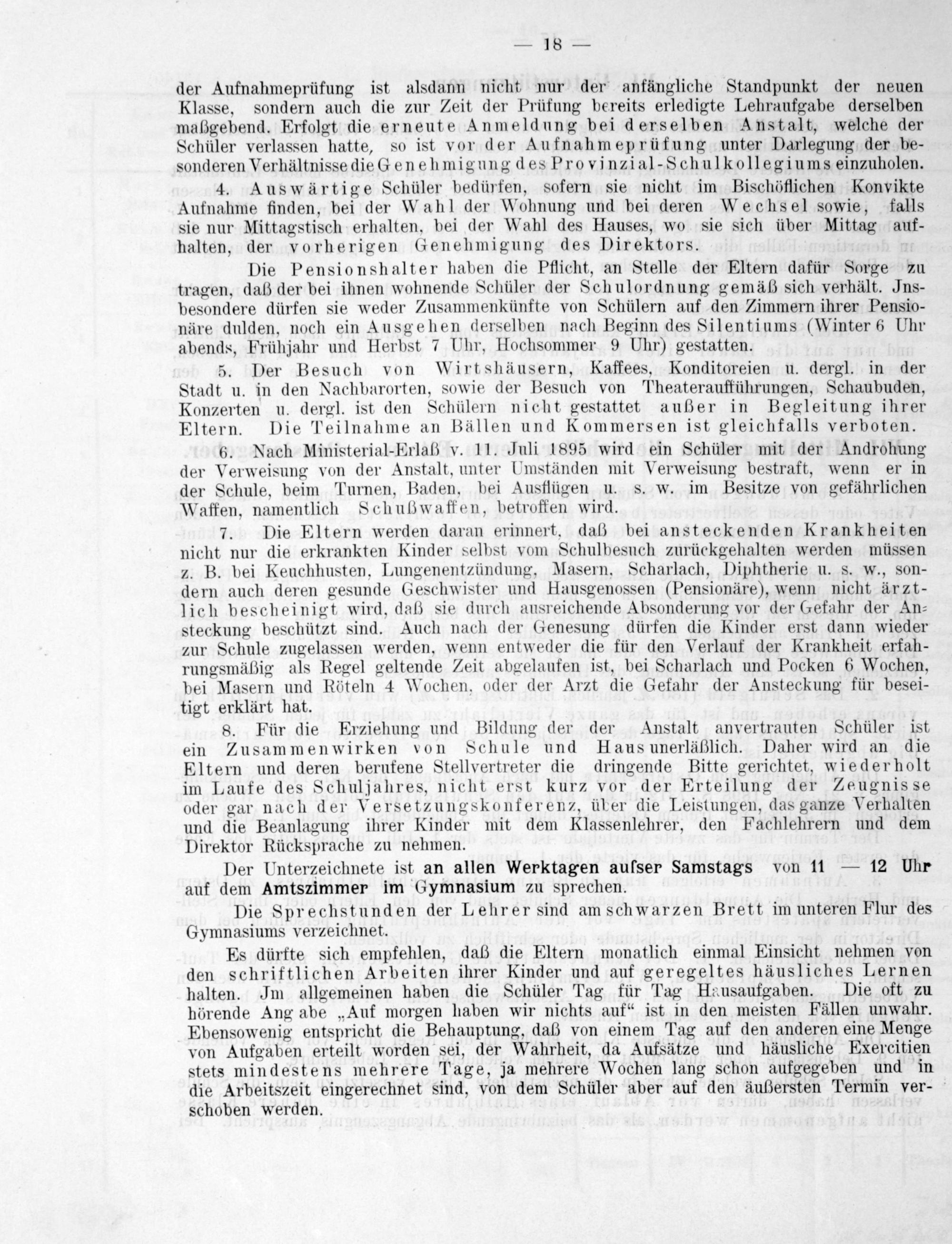 4. Auswärtige Schüler bedürfen, sofern sie nicht im Bischöflichen Konvikte Aufnahme finden, bei der Wahl der Wohnung und bei deren Wechsel sowie, falls sie nur Mittagstisch erhalten, bei der Wahl des Hauses, wo sie sich über Mittag auf- halten, der vorherigen Genehmigung des Direktors.