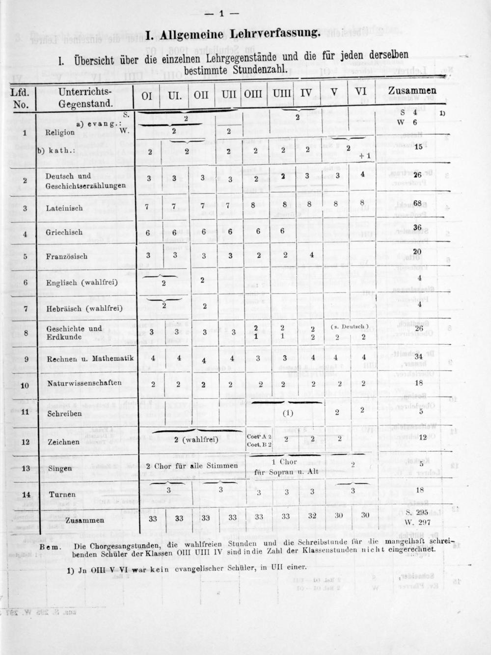 I. Übersicht über die einzelnen Lehrgegenstände und die für jeden derselben bestimmte Stundenzahl.