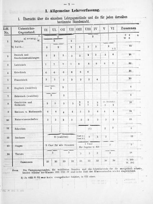 — Lfd. Unterrichts- 0I VI. OII VUII OIII UIII IV. V 1 Zusammen No. Gegenstand. 8———— S.— 8 4 a) evang.: 2 2 w 6 1) 1 Religion W 2 2 —————— 85 b) kath.: 2 2 2 2 2 2 2 15 + 1 2 Deutsch und V 2 3 3 3 2 3 3 4 Geschichtserzühlungen 3 2 26 3 Lateinisch 7 7 7 7 8 8 8 8 8 68 —— 4 Griechisch 6 6 6 6 6 6 36 —— 5 Französisch 3 3 3 3 2 2 4 20 .—— 1 6 Englisch(wahlfrei) 2 2 4 —— 2. 7 Hebräisch(wahlfrei) 2 2 I V— 4 Geschichte und—, 8— 8 Erdkunde 3 3 3 3 1 2 2(s. Deutsch) V 26 2 2 2 9 Rechnen u. Mathematik 4 V 4 4 4 3 3 V 4 4 4 V 34 10 Naturwissenschaften 2 2 2 2 2 2 2 2 2 18 . — 5 11 Schreiben(4) 2 V 2 5 ———— 1² Zeichnen 2(wahlfrei) CoetA? 2 2 2 12 Coet. B 2 ———— 3—— 13 Singen 2 Chor für alle Stimmen 1 Chor 2 1 5 für Sopran u. Alt ——;——— ,— 14 Turnen 3 3 3 3 3 3 18 —————————— zZusammen 33 33 33 33 33 33 32 30 30 8. 295 W. 297 — Bem. Die Chorgesangstunden, die wahlfreien Stunden und die Schreibstunde für die mungelhaft schrei-