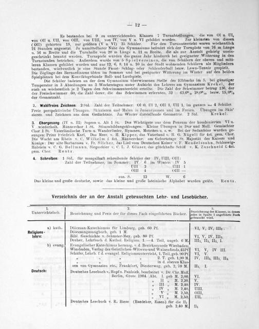 Die Schüler badeten an der dem Gymnasiunm überwiesenen Stelle des Elbbachs im S. bei günstiger Temperatur in 3 Abteilungen an 3 Wochentagen unter Aufsicht des Lehrers am Gymnasium Krekel, der auch an wöchentlich je 2 Tagen den Schwimmunterricht erteilte. Die Zahl der Schwimmer betrug 136, der der Freischwimmer 60, die Zahl derer, die das Schwimmen erlernten, 32= 63,6%. 28,0%, bezw. 15, 0%