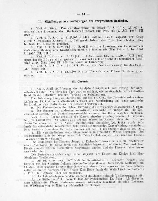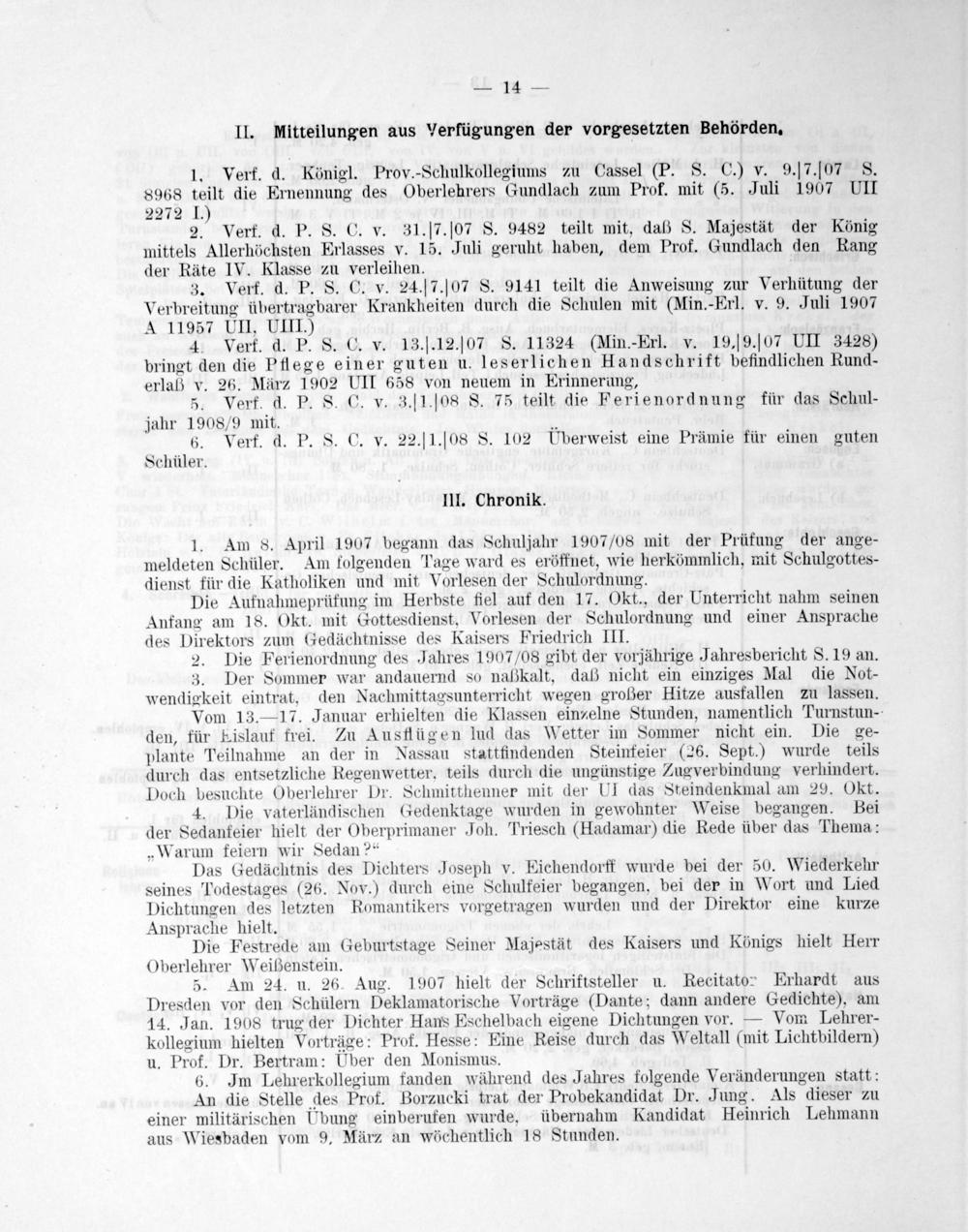 1. Verf. d. Königl. Prov.-Schulkollegiums zu Cassel(P. S. C.) v. 9. 7.107 S. 8968 teilt die Ernennung des Oberlehrers Gundlach zum Prof. mit(5. Juli 1907 UII 2272 I.)