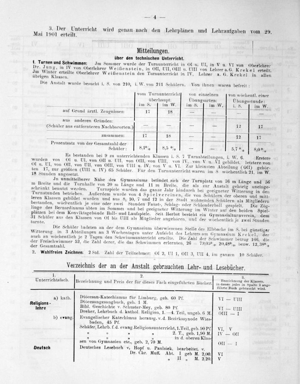 1. 2. 3. Unterrichtsfach. Bezeichnung und Preis der für dieses Fach eingeführten Bücher.] in—2 führte Buch gebraucht wird. a) kath. Diöcesan-Katechismus für Limburg, geb. 60 Pf. VI— UIII Religions- Diöcesangesangbuch, geb. 1 M. jehre Bibl. Geschichte v. Schuster-Mey, geb. 80 Pf. VI— UIII Dreher, Lehrbuch d. kathol. Religion, 1.—4. Teil, ungeb. 6 M.] OIII— 1 b) evang.] Evangelischer Katechimus herausg. v. d. Bezirkssynode Wies- baden, 45 Pf. Schäfer, Lehrb. f. d. evang. Religionsunterricht, 1. Teil, geb. 90 Pf.] VI, V „„„„ 2. T., geb. 1,90 M. IV— 01I 3„„„ in d. oberen Klas- sen von Gymnasien etc., geb. 2, 70 M. 0II— 1 Deutsch Deutsches Lesebuch v. Hopf u. Paulsiek, bearbeitet. v. Dr. Chr. Muff. Abt. I geb M. 2,00.] VI „ II„ M. 2,20. V