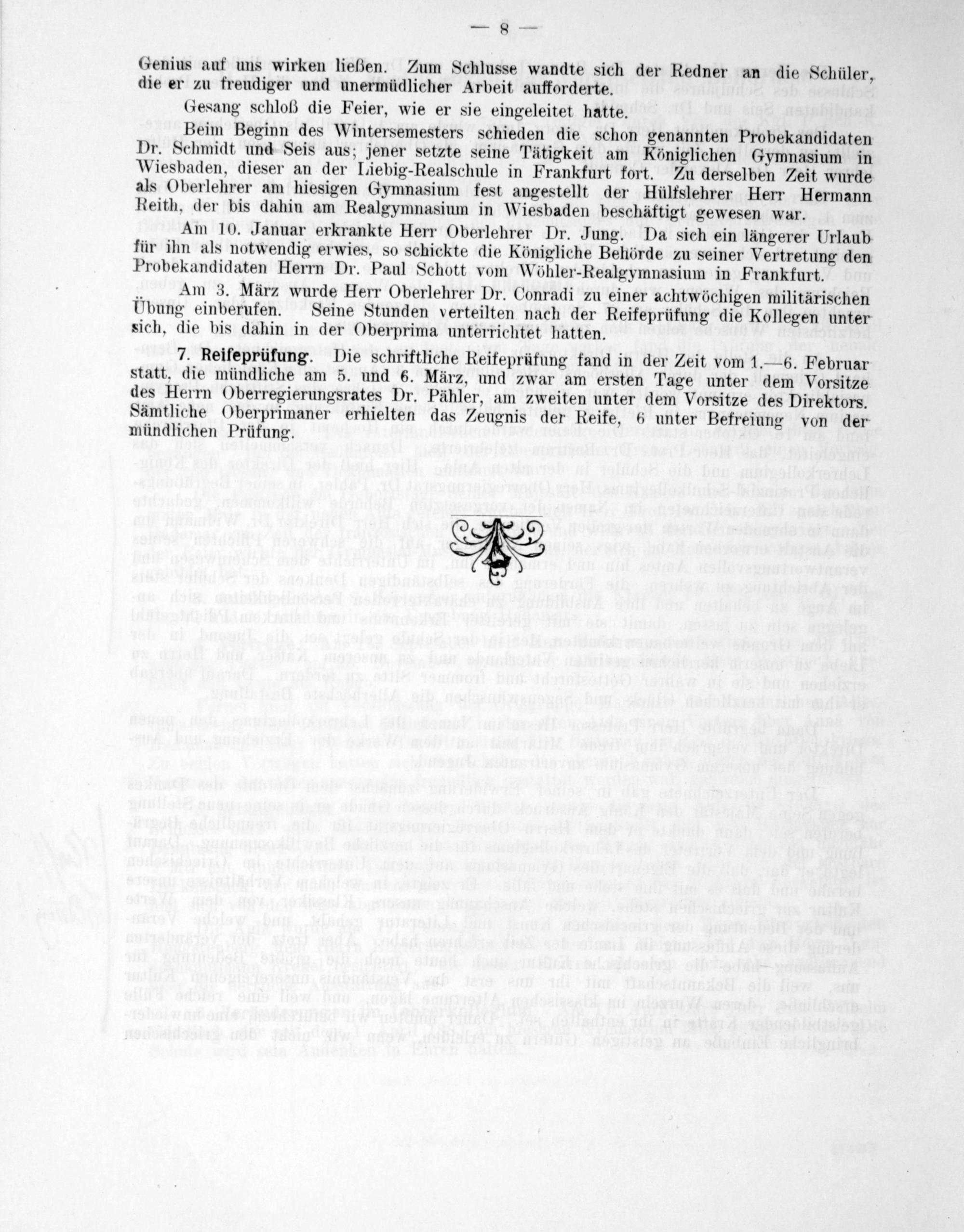 Beim Beginn des Wintersemesters schieden die schon genannten Probekandidaten Dr. Schmidt und Seis aus; jener setzte seine Tätigkeit am Königlichen Gymnasium in Wiesbaden, dieser an der Liebig-Realschule in Frankfurt fort. Zu derselben Zeit wurde als Oberlehrer am hiesigen Gymnasium fest angestellt der Hülfslehrer Herr Hermann Reith, der bis dahin am Realgymnasium in Wiesbaden beschäftigt gewesen war.