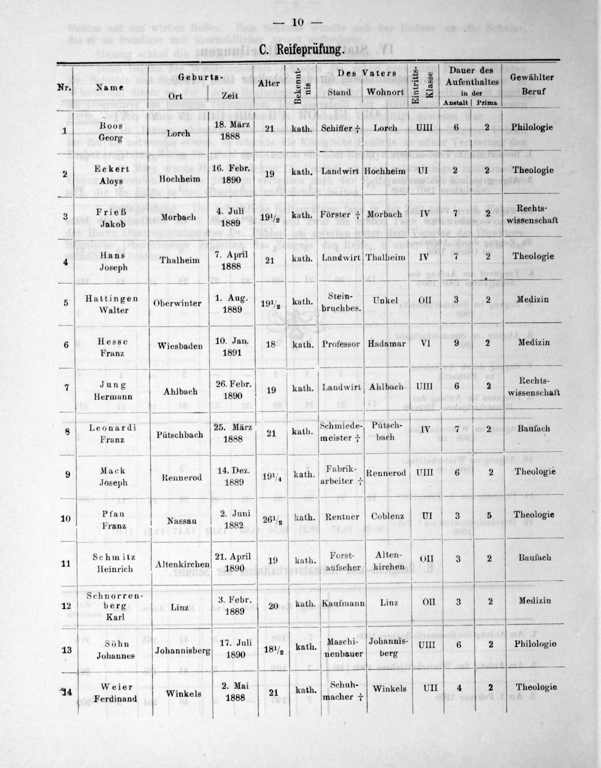 Geburts. 2 Des Vaters ³ Dauer des Nr. Name Alter 5 2* ¾ Aufenthaltes Gewählter Ort Zeit 8 Stand Wohnort † in der Beruf I ₰ 8 Anstalt] Prima 8 Boos 18. März.. 1 21 kath. Schiffer Lorcl- UIII 6 2]hil 1 Georg Lorch 1888 iner; 46 Philologie Eckert 16. Febr.;— 4 . Land 2 Aloys Hochheim 1890 19 kath. Landwirt Hochheim UI 2 2 Theologie Frieß 4. Juli. Rechts- 3 M 1 1 kath. Förster † Morbach IV 7 2 Jakob orbach 1889 19 ½ 1 wissenschaft 4 Hans Thalheim 7. April 21 V kath. Landwirt Thalheim IV 7 2 Theologie Joseph 1888 Martinges en,rnh. 4. Aug. ar. Tuen 5 attingen Obperwi Aus.„ kath. in VUnkel OIll 3 2 Medizi Walter berwinter] 1889 19 ⁵ kath. bruchbes. f elemn ——————— 6 Hesse Wiesbaden 10. Jan 18 kath. Professor Hadamar VI 9 2 Medizin Franz 1891 7 Jung 26. Febr Kath. Landwirt Ahlbach. UII 6 2 RKRechls Hermann Ahlbach 1890 19 kath. nadn lhach wissenschaft V V V 4 8 Leonardi 25. März Schmiede- Pütsch- 8 ütsc. katl IV 7 2 Baufach Franz Pütschbach 1888 21 Path meister † bach 7 ybpάẽ— Mack 14. Dez Fabrik- 32 9 er kath. Re d UII 6 2 Theologie Joseph Rennerod 1889 19 ¼ kath. wheiter. ennero V V ologi 10 Ffau Nassau 2. Juni 26 ½ kath. Rentner Coblen⸗ UI V 3 5 Theologie V Franz 1882* V — 6*— †———O—ͤͤſ1— Schmitz 21. April Forst- Alten- ir 19 kath. OII 3 2 Baufach 41 Heinrich Altenkirchen 1890 25 aufseher kirchen ——————————— Schnorren- 3. Feb 12 berg Linz Febr. 20 kath. Kaufmann Linz OlI 3 2 Medizin 1889 Karl —————— Söhn 17. Juli Maschi- Johannis-;. kath. UIII 6 2 Philologie 13 Johannes Johannisberg 1890 18 ½ Path nenbauer berg 2 Weier 2. Mai Schuh-. 4 14 7 kath. Winkels UII 4 2 Theologie Ferdinand Winkels 1888 21 4 macher † g