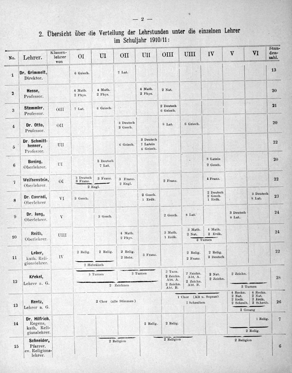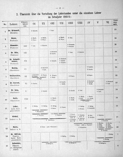 2. Ubersicht über die Verteilung der Lehrstunden unter die einzelnen Lehrer im Schuljahr 1910/11: Klassen-. Stun- No. Lehrer. lehrer OlI UI oI DII OII V V VI den. von zahl. 1 9. deenmalt) V 6 Griech V 7 Lat 13 irektor. ——————— Hesse, 4 Math 4 Math. 4 Math. 2 Nat. V Professor. V 2 Phys. 2 Phys. 2 Phys 20 “ 3 Stemmler, OlII 7 Lat. 6 Griech. 2 Deutsch 21 Professor I 6 Griech. —————————— 1 d V 3 Deutsch 4 r. Otto, O11 eutsc. 1 Profossor. I 4 Gesch. 3kes nrleen 20 —4 er e— Dr. Schmitt- 3 Deutsch 5 henner, UlI G Griech. 7 Latein 22 Professor. 6 Griech. “ 6 V Bosing, oI 3 Deutsch 8 Latein 20 V Oberlehrer. V 4 7 Lat. 2 Gesch. „ peutseh Urnr 7 werren 01 V 3 Peutee I 3 Franz. 3 vren⸗ 2 Nrn. 4 Franz. 22 erlehrer 4 2 Engl. ung 5 2 D Dr. Conradi 3 2 Gesch. eutsch 3 Deutsch 8 Nee 11 8 Geeh V 1 Erdk.— 8 Lat. 23 ———— Dr. lung 9*— 3 Deutsch Oberlehrer. N V 3 Gesch. V 2 Gesch. 8 Lat. 8 en d 24 ———— Reith, UIII 4 Math. 3 Math. 3 iach. 4 Ara. 10 Oberlehrer. 2 Phys. 1 Erdk. 3 Aas. 2 Erdle 24 3 Turnen W1 I 1 4 11 kbeber,“ 2 Reljc. 2 Rells. 2 Kellg, 3 Prau⸗ 2 Relig. 2 Relig. 22² athe Reli 2 Hebr. 2 Franz. 3 Deutsch Lionsjehrer 2 Hebräisch —— 3 † 12 V Krekel, 4 3 Turnen V 3 Turnen 2 Zacha. 2 Jelehn. 2 Nat. 2 Zeichn. 4.. Abt. A. 2 Zeichn. 2 Zeichn 28 2 Zeichnen 2 Zeichn. Abt. B.—— Abt. B. 3 Turnen 49 2 4 Neohn. 4 Rechn. 1 t.. 13 Rentz, 2 Chor(alle Stimmen) 9 9 4. Sopran) 2 Hrdk. 2 Bah. Lehrer a. G. ee 2 Schreib.] 2 Schreib. 26 — ——— 2 Gesang Dr. Hilfrich, 14 Regens.. 1 Relig. 7 Kath. Reli- V 2 Relig. 2 Relig. glonslehrer. V 2 Relg. 15 dotnelder, V 2 Religion 2 Religion 2 Rehgion arrer, ev. Religions- V 6 lehrer.
