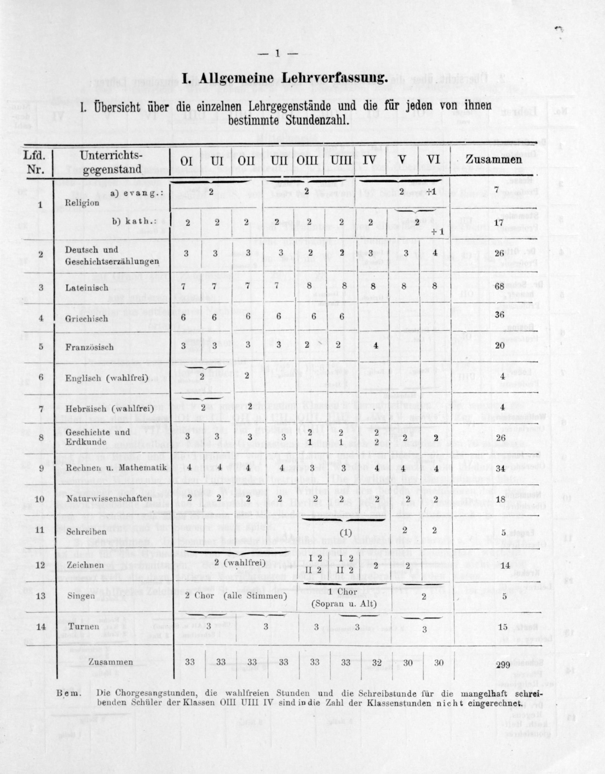 Bem. Die Chorgesangstunden, die wahlfreien Stunden und die Schreibstunde für die mangelhaft schrei- benden Schüler der Klassen OIII UIII IV sind in die Zahl der Klassenstunden nicht eingerechnet.