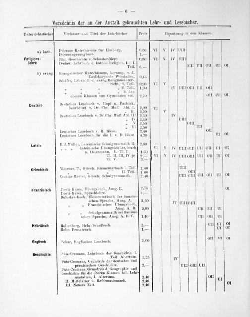 Unterrichtsfächer Verfasser und Titel der Lehrbücher Preis Benutzung in den Klassen 2 9 a) kath. Diöcesan-Katechismus für Limburg. 0.60 VI V IV ſon Diöcesangesangbuch. 1,— Religions- Bibl. Geschichte v. Schuster-Mey- 0,80 VI. vW om lehre Dreher, Lehrbuch d. kathol. Religion, 1.—4. Teil. 6.— OIII UII OII UIOI 1 b) evang.] Evangelischer Katechismus, herausg. v. d. Bezirkssynode Wiesbaden. 0,45 Schäfer, Lehrb. f. d. evang. Religionsunter- 3 b richt, 1. Teil. 0,90 vIV. „„„„ 2. Teil. 1,90 lV L üö „„„ in den V oberen Klassen von Gymnasien etc. 2,70 0II UI 01 2 Deutsch Deutsches Lesebuch v. Hopf u. Paulsiek, bearbeitet v. Dr. Chr. Muff. Abt. I. 2,00 VI „ II. 2,20 v Deutsches Lesebuch v. Dr. Chr. Muff. Abt. III.] 2,40 IV „ IY. 2,40 Cl „ V.] 2,50 OIII „ VI. 2,50 un Deutsches Lesebuch v. R. Biese. 2,40 V OII Deutsches Lesebuch für die I. v. R. Biese 4,20 V V UI 0I Latein H. J. Müller, Lateinische Schulgrammatik B. 2,60 V „„„ Lateinische Ubungsbücher, bearb. vI v lv CIII OIII UII OII UI01 n. Ostermann. B. Tl. I 1,60 21 W. Il, m ze 2e. eIv IV CIIIOIIe .V. 3.— Griechisch Wesener, P., Griech. Elementarbuch I. Teil.] 1, 40 o „„„ II. Teil. 1, 60 V OlII Curtius-Hartel, Griech. Schulgrammatik. 2, 40 UIII OIII UII OII UI 01 * V Französisch Ploetz-Kares, Übungsbuch, Ausg. B. 2,75 01 Ploetz-Kares, Sprachlehre. 1.— Dubislav-Boek, Eleuentarbuch der französi- 4 schen Sprache, Ausg. A. 2,60 „ Französisches Übungsbuch, IV UIII]OIII Ausg. A, B. 2,60 0OII UI ..„ Schulgrammatik der französi- 4 v schen Sprache, Ausg. A, B, 0. 1,40 UII ö Hebräisch Hollenberg. Hebr. Schulbuch. 3,— 0IIUIOI Hebr. Pentateuch. 1,— UI 0I Englisch Fehse, Englisches Lesebuch. 2, 00 olI UI0 Geschichte Pütz-Cremans, Lehrbuch der Geschichte, I. Teil: Altertum.] 1, 35— Pütz-Cremans, Grundriſs der deutschen und 3 IV preufsischen Geschichte. 2,— IIIUI Putz-Cremans, Grundriſs d. Geographie und 3 viI Oin un Geschichte für die oberen Klassen höh. Lehr- anstalten, I. Altertum. 2,40 0II II. Mittelalter u. Reformationszeit. 2,40 UI III. Neuere Zeit. 2,40 01