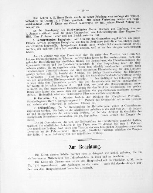 An der Beerdigung des Hochwürdigsten Herrn Bischofs von Limburg, die am 9. Januar stattfand, nahm die ganze Unterprima, vom Lehrerkollegium Herr Regens Dr. Hild, Herr Professor Leber und der Berichterstatter teil.