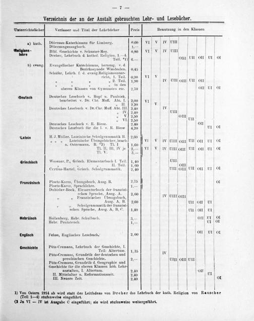 1) Von Ostern 1914 ab wird statt des Leitfadens von Dreher das Lehrbuch der kath. Religion von Rauscher (Teil 1— ⁴) stufenweise eingeführt. (2 In VI— WI ist Ausgabe C eingeführt; sie wird stufenweise weitergeführt.