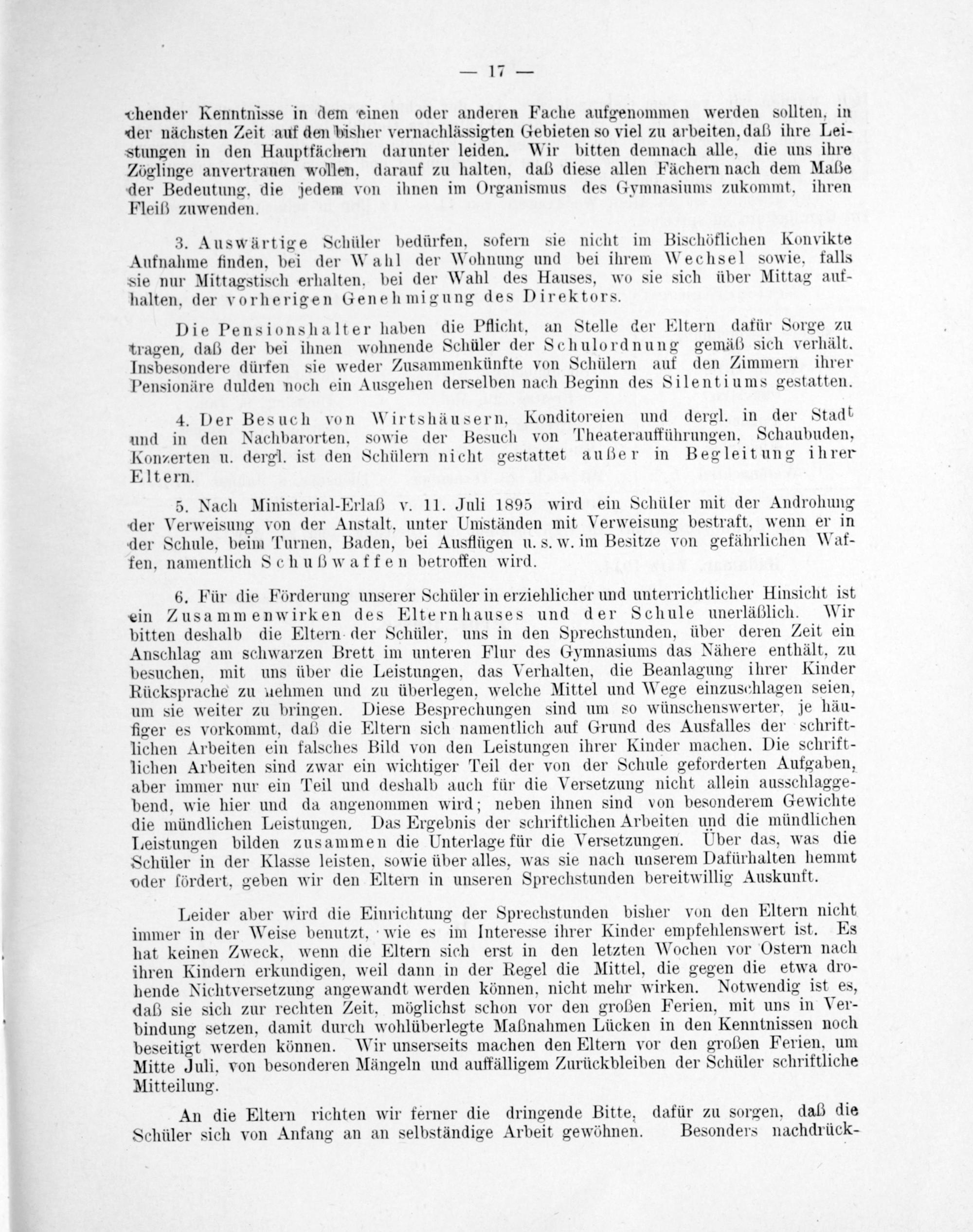 4. Der Besuch von Wirtshäusern. Konditoreien und dergl. in der Stadt und in den Nachbarorten, sowie der Besuch von Theateraufführungen. Schaubuden, Konzerten u. dergl. ist den Schülern nicht gestattet außer in Begleitung ihrer Eltern.