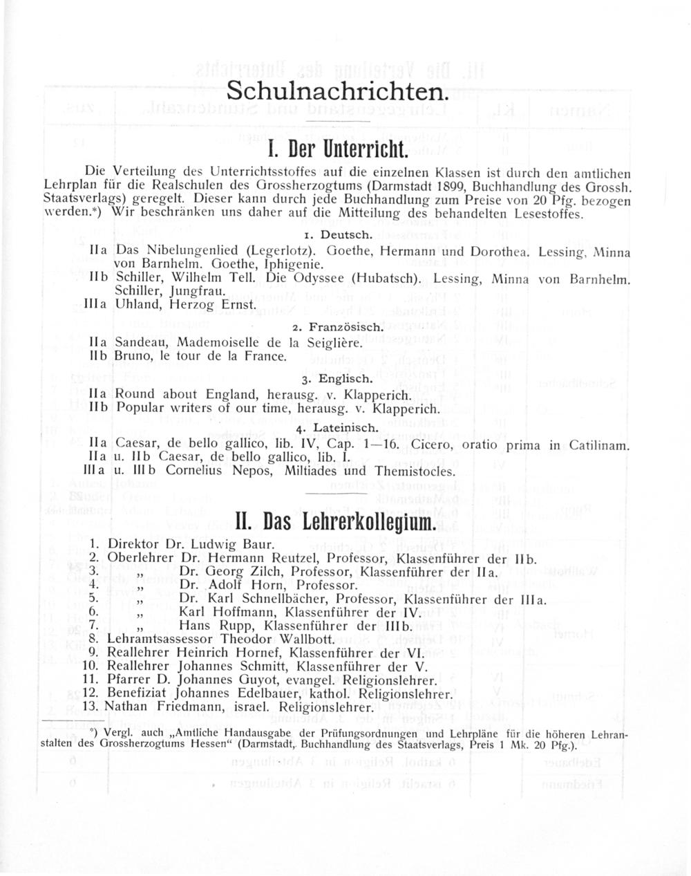 I. Der Unterricht. Die Verteilung des Unterrichtsstoffes auf die einzelnen Klassen ist durch den amtlichen Lehrplan für die Realschulen des Grossherzogtums(Darmstadt 1890, Buchhandlung des Grossh.
