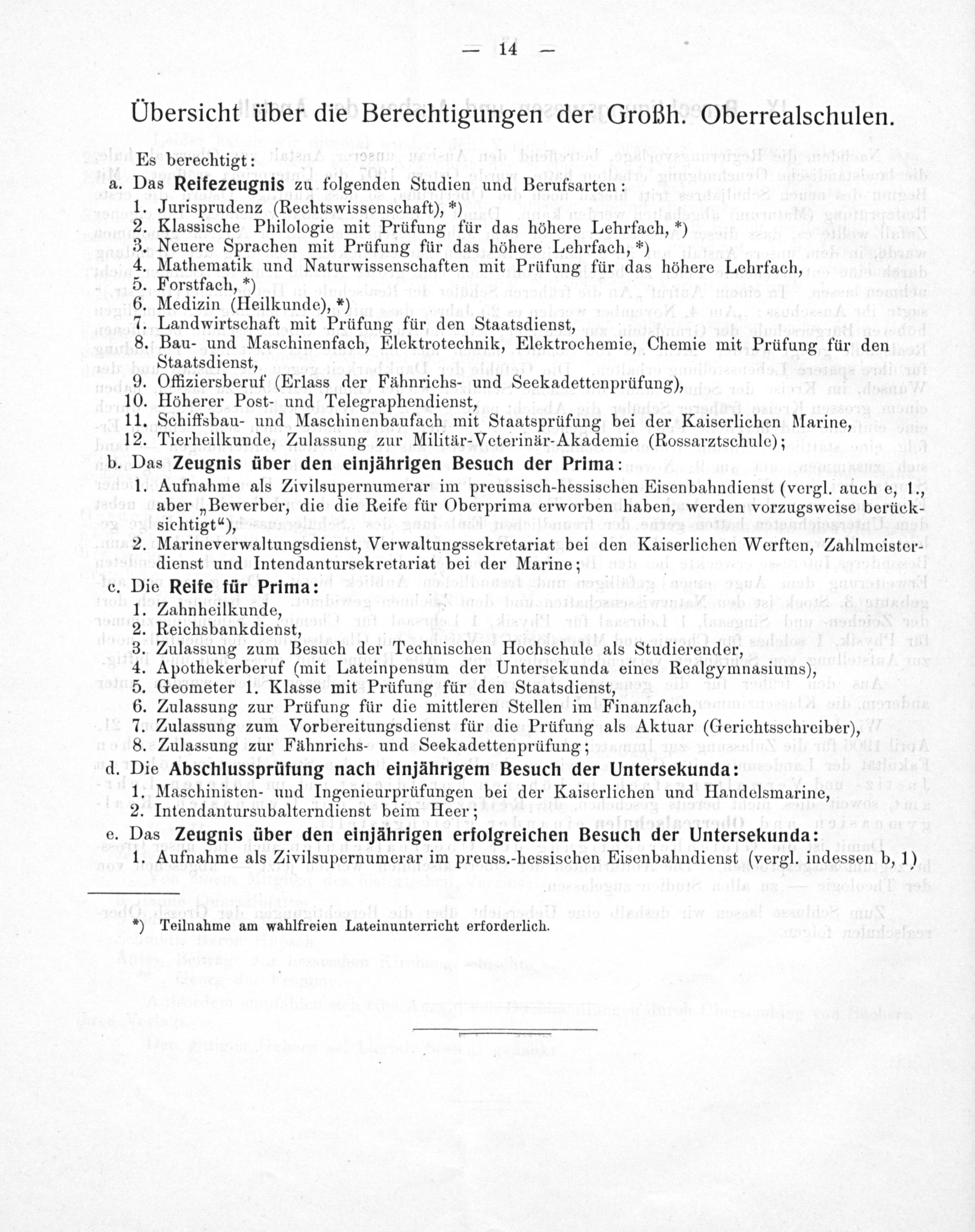 Medizin(Heilkunde),*) Landwirtschaft mit Prüfung für den Staatsdienst, . Bau- und Maschinenfach, Elektrotechnik, Elektrochemie, Chemie mit Prüfung für den Staatsdienst, 9. Offiziersberuf(Erlass der Fähnrichs- und Seekadettenprüfung), 10. Höherer Post- und Telegraphendienst, 11. Schiffsbau- und Maschinenbaufach mit Staatsprüfung bei der Kaiserlichen Marine, 12. Tierheilkunde, Zulassung zur Militär-Veterinär-Akademie(Rossarztschule); b. Das Zeugnis über den einjährigen Besuch der Prima: