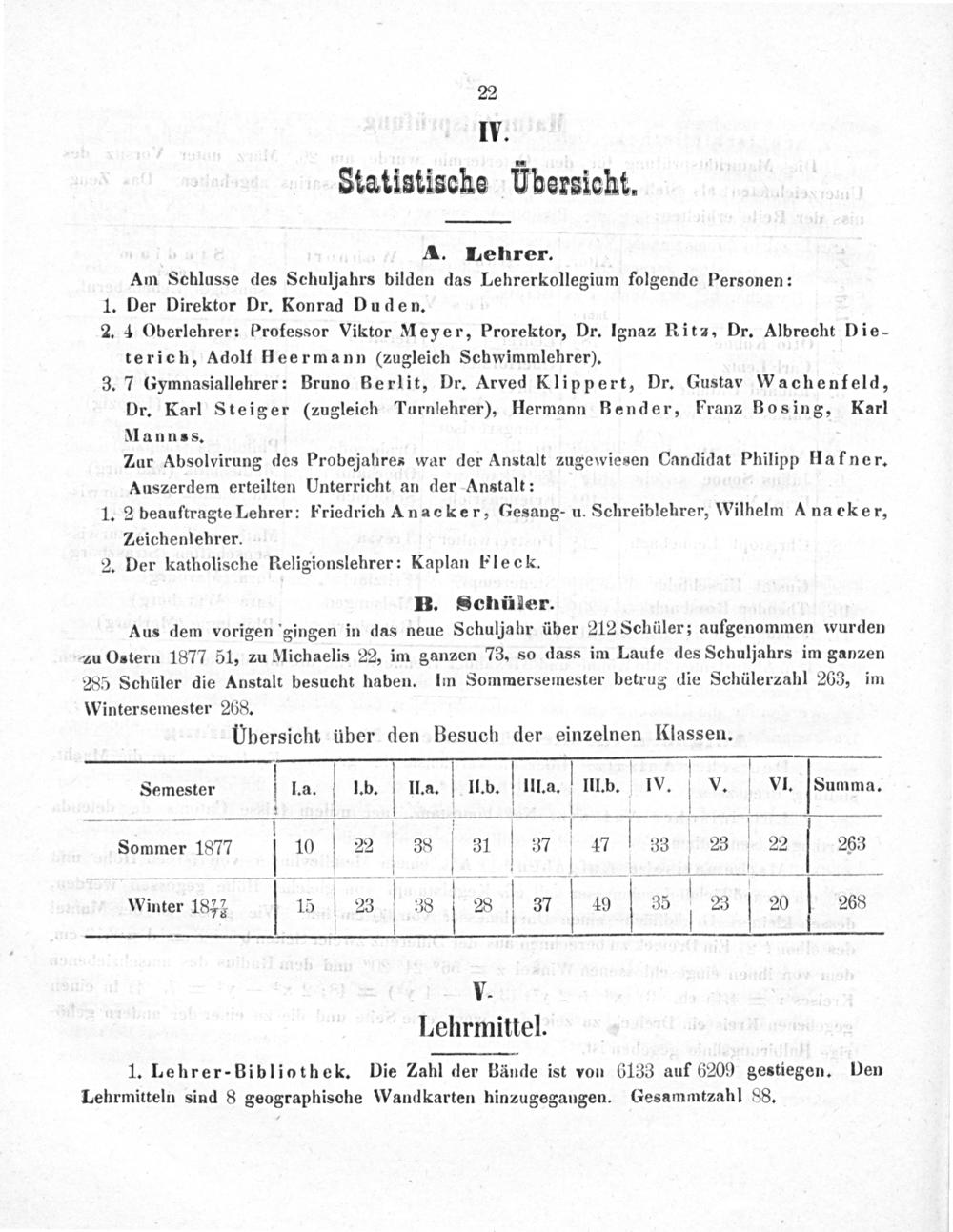 2. 4 Oberlehrer: Professor Viktor Meyer, Prorektor, Dr. Ignaz Ritz, Dr. Albrecht Die- terich, Adolf Heermann(zugleich Schwimmlehrer).