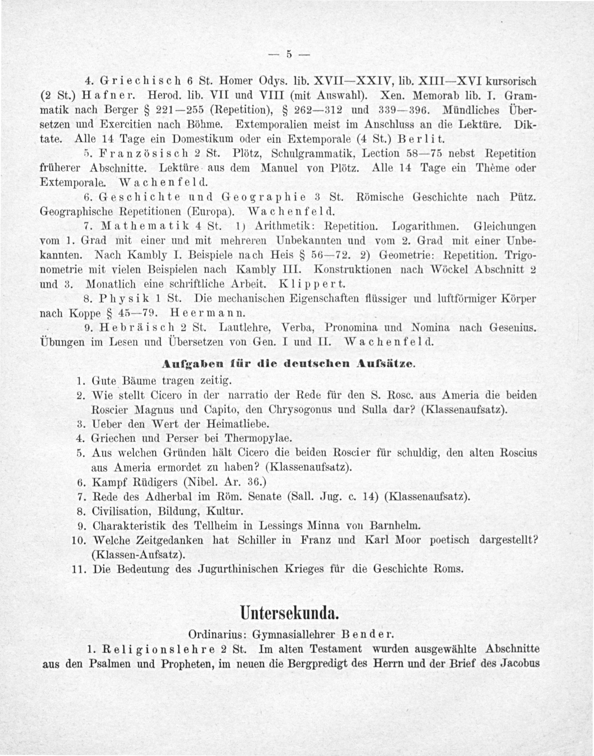4. Griechisch 6 St. Homer Odys. lib. XVII—XXIV, lib. XIII—XVI kursorisch (2 St.) Hafner. Herod. lib. VII und VIII(mit Auswahl). Xen. Memorab lib. I. Gram- matik nach Berger§ 221— 255(Repetition),§ 262— 312 und 339— 396. Mündliches Über- setzen und Exercitien nach Böhme. Extemporalien meist im Anschluss an die Lektüre. Dik- tate. Alle 14 Tage ein Domestikum oder ein Extemporale(4 St.) Berlit.