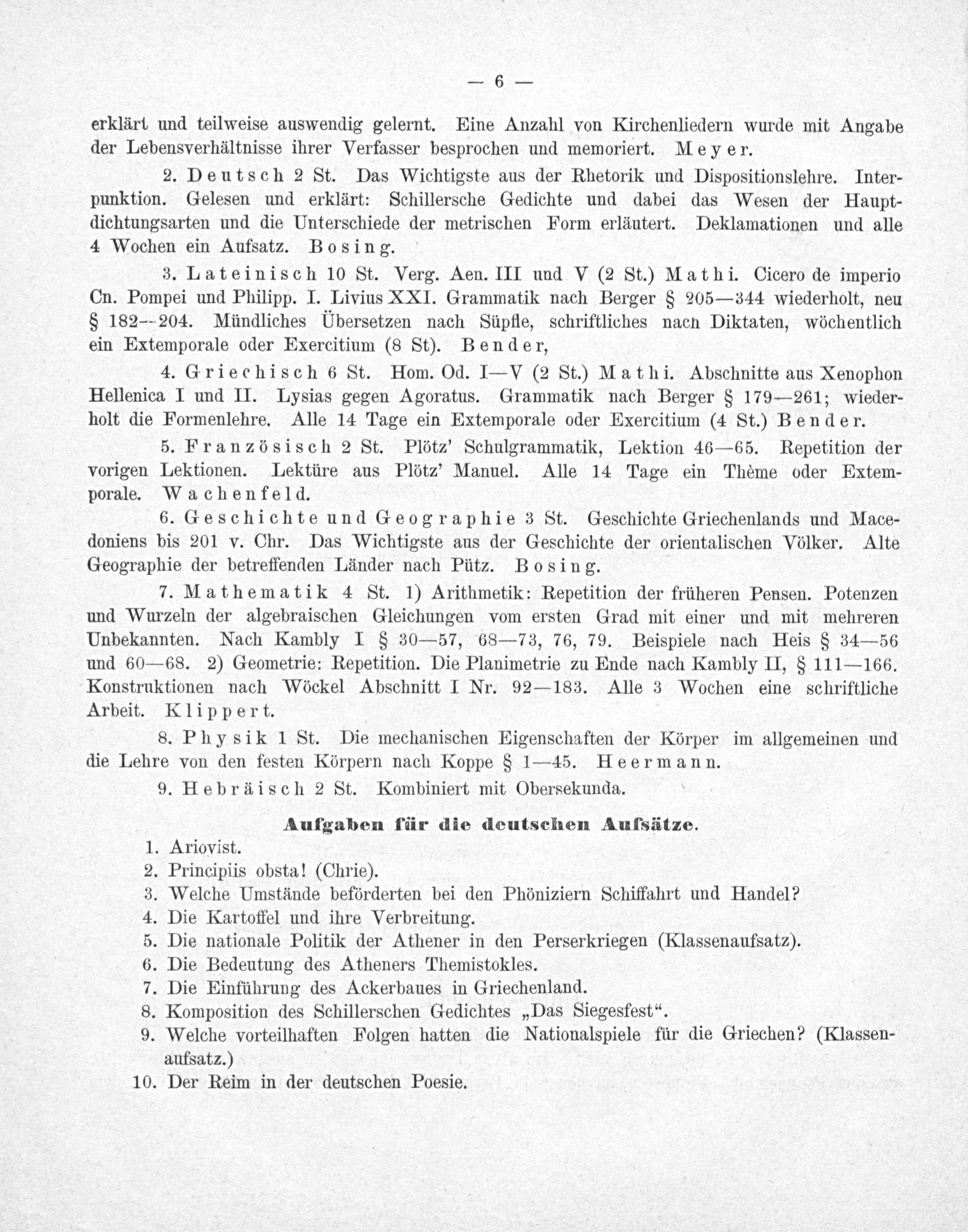 2. Deutsch 2 St. Das Wwichtigste aus der Rhetorik und Dispositionslehre. Inter- punktion. Gelesen und erklärt: Schillersche Gedichte und dabei das Wesen der Haupt- dichtungsarten und die Unterschiede der metrischen Form erläutert. Deklamationen und alle 4 Wochen ein Aufsatz. Bosing.