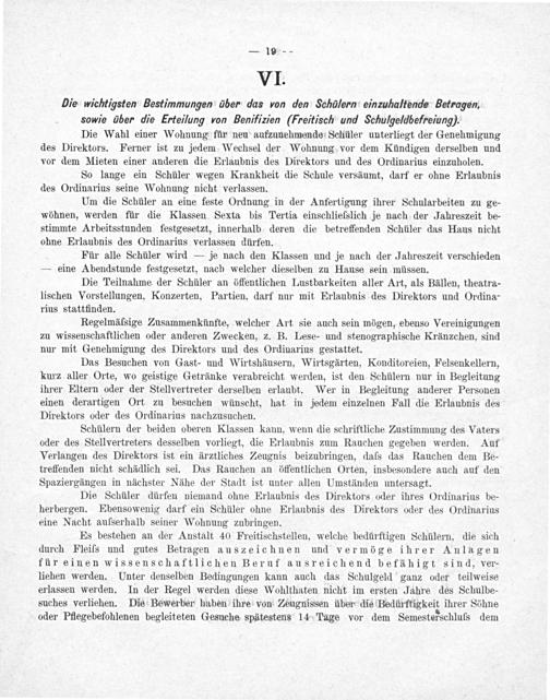 Das Besuchen von Gast- und Wirtshäusern, Wirtsgärten, Konditoreien, Felsenkellern, kurz aller Orte, wo geistige Getränke verabreicht werden, ist den Schülern nur in Begleitung ihrer Eltern oder der Stellvertreter derselben erlaubt. Wer in Begleitung anderer Personen einen derartigen Ort zu besuchen wünscht, hat in jedem einzelnen Fall die Erlaubnis des Direktors oder des Ordinarius nachzusuchen.