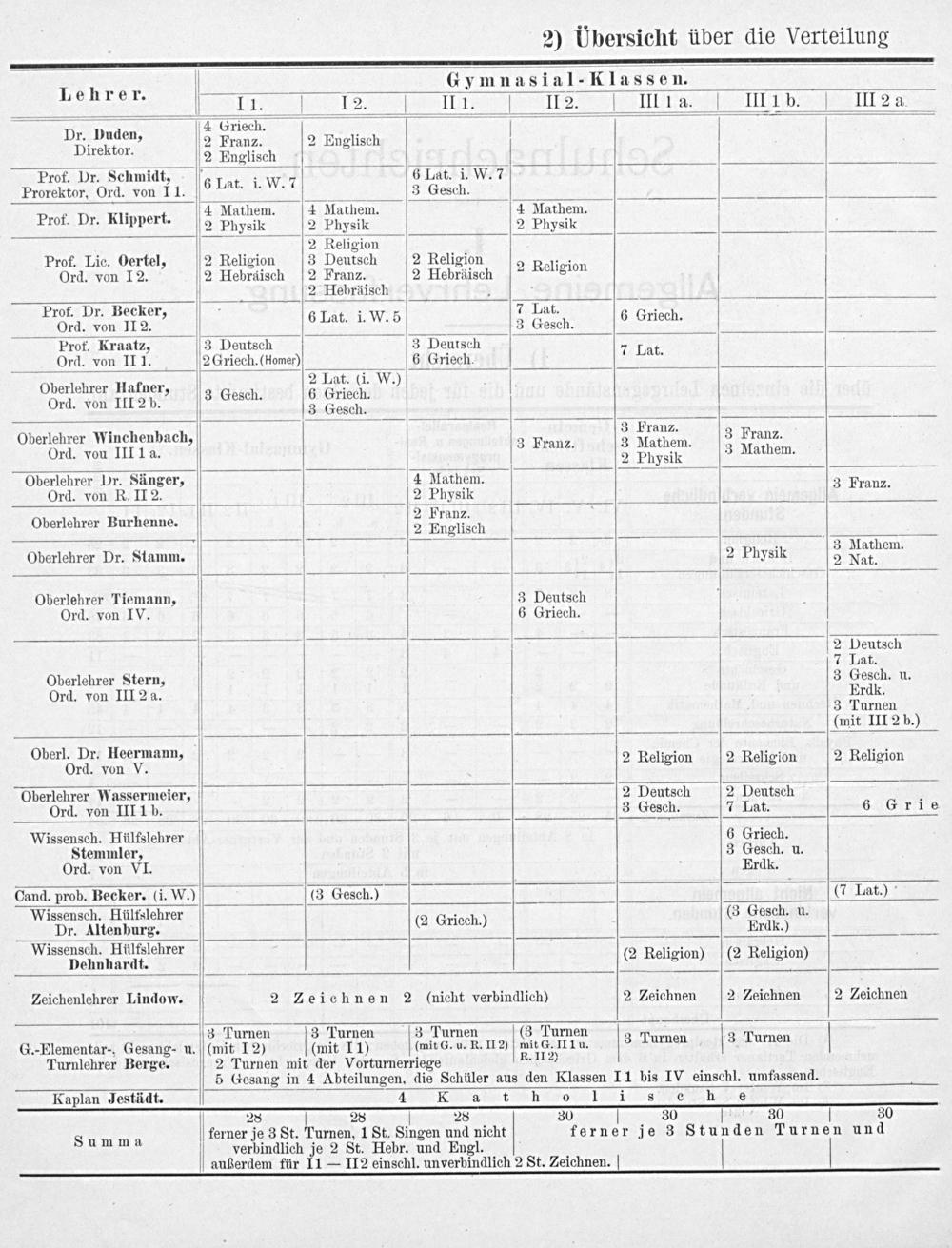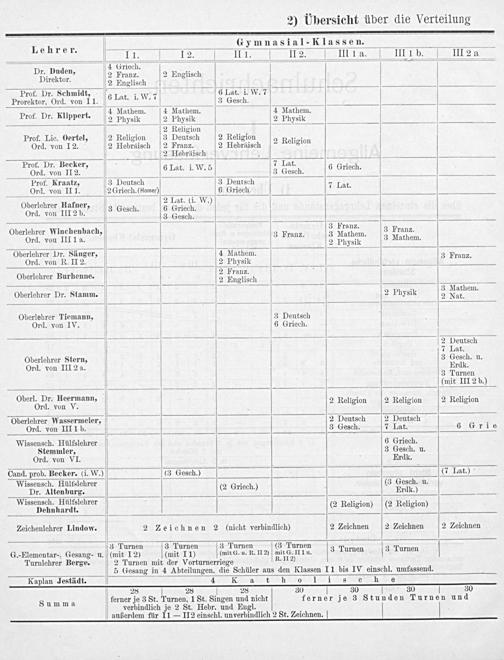 11. Ie i e ie b ee 4 Griech. Vr. Dädem. 2 Franz. 2 Englisch V iroktor. 2 Englischh Prof. Dr. Schmidt,’; 6 Lat. i. W. 7 Prorektor, Ord. von 11. 6 Lat. i. W. 7 3 Gesch. 3. 4 Mathem. 4 Mathem. 4 Mathem. Prof. Dr. klippert. 2 Physik 2 Physik 2 Physik 2 Religion Prof. Lic. Oertel, 2 Religion 3 Deutsch 2 Religion 2 Religion Ord. von I2. 2 Hebräisch 2 Franz. 2 Hebräisch 1910 2 Hebräisch Prof. Dr. Becker. 7 Lat. 3 Grj Ord. von II2. 6Lat. i. W. 5 3 Gesch. 6 Griech. Prof. Kraatz, 3 Deutsch 3 Deutsch 7 Lat Ord. von II 1. 2 Griech.(Homer) 6 Griech. at. Oberlehrer Hafner, 3 Gesch 7 Tat. ci W.) Ord. von III 2 b.. 3 Gesch. 7. 3 Franz. Oberlehrer Winchenbach, 2 3 Franz. 3 Franz. 3 Mathem. 7 Ord. vou III 1 a. 2 Physik 3 Mathem. Oberlehrer Dr. Sänger, 4 Mathem.. Ord. von R. II 2. 2 Physik 3 Fran7. . 2 Franz. Oberlehrer Burhenne. 2 Englisch Oberlehrer Dr. Stamm. 2 Physik 3 Marhenn. Oberlehrer Tiemann, 3 Deutsch Ord. von IV. 6 Griech. 2 Deutsch 7 Lat. Oberlehrer Stern, 3 Gesch. u. Ord. von III 2 a. Erdk. 3 Turnen (mit III 2 b.) berl. Dr. Heermann„.. Ober Or 51 Fon v 3 2 Religion 2 Religion 2 Religion Oberlehrer Wassermeier, 2 Deutsch 2 Deutsch Ord. von III I1 b. 3 Gesch. 7 Lat. 6 Grie Wissensch. Hülfslehrer 6 Griech. Stemmler, 3 Gesch. u. Ord. von VI. Erdk. Cand. prob. Becker.(i. W.)(3 Gesch.)(7 Lat.) Wissensch. Hülfslehrer(3 Gesch. u. Dr. Altenburg.(2 Griech) Erdk.) Wi h. Hülfsleh- 3.3. asaeneene lnde ehrer(2 Religion)(2 Religion) Zeichenlehrer Lindow. 2 Zeichnen 2(nicht verbindlich) 2 Zeichnen 2 Zeichnen 2 Zeichnen 3 Turnen 3 Turnen 3 Turnen(3 Turnen. G.-Elementar-, Gesang- u.(mit I 2)(mit I 1)(mit G. u. R. II 2) mit G, IIl u. 3 Turnen 3 Turnen Turnlehrer Berge. 2 Turnen mit der Vorturnerriege R. II2) 5 Gesang in 4 Abteilungen, die Schüler aus den Klassen I1 bis IV einschl. umfassend. Kaplan Jestädt. 4 KR a t h o 1l i s c hn e 28 30 30 30 30
