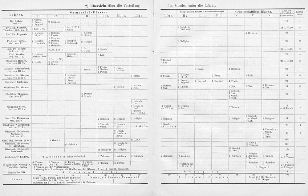2 Lat.(i. W.) Oberlehrer Hafner, pri 2 Deutsch; U 9. Ord. von III2 b. 3 Gesch. 9 Griecl 7 Lau 21 i. W. 22 3 . 3 Franz. Oberlehrer Winchenbach 3 5 3 Franz.„ Ord. vou IIIl a. 5 3 Franz. 3 Matham 3 Mathem. 2 Franz. 4 Rechnen 23 7 Oberlehrer Dr. Sänger, 4 Mathem. 5 Mathem. 1 Ord. von R. II 2. 2 Physik 3 Pran. 3 Franz. 3 Physik 2 Franz. 2 Prdk. 24 5 Oberlehrer Burhenne- 2 Franz. 4 Pranz. 4 Englisch 4 Englisch 4 Franz 23 7 . 2 Englisch 3 Englisch 2 g Tanz. 2 7 Oberlehrer Dr. Stamm. 2 Physik 3 leachem 3 MHachem. 2 Chemie 2 Nat. 2 Nat. 4 Keeimnen 24 3 3 Deutsch Oberlehrer Tiemann, 3 Deutsch 7 Lat. 23 4 Ord. von IV. 6 Griech. 2 Gesch. 1 2 Erdk. 2 Deutsch 7 Lat. Oberlehrer Stern, 3 Gesch. u.(3 Turnen 3 Deutsch 8 18 Ord. von III 2 a.. Erdk. mit III 2 a) 3 Lat. 3 Turnen u. 6 Turnen 4 3 Turnen. (mit III 2 b.) Oberl. Dr. Heermann 85 3 Deutsch Ord. von V 5 2 Religion 2 Religion 2 Religion 2 RKeligion 2 Religion u. Gesch. 3 Religion 24 2 . 8 Lat. 4 Oberlehrer Wassermeier, 2 Deutsch 2 Deutsch 3 Gesch. 3 S Ord. von III 1 b. 3 Gesch. 7 Lat. 6 Grie ehisch 6 23 4 Wissensch. Hülfslehrer 6 Griech. 4 Deutsch u. Stemmler, 3 Geieh. u.. 8 Rasch. 23 3 Ord. von VI. Erdk. 2 Erdk. Cand. prob. Becker.(i. W.)(3 Gesch.)(7 Lat.)(10) Wissensch. Hülfslehrer r(3 Gesch. u.(2 Erdk.) Dr. Altenburg.(2 Griech.) Erdk.)(3 Turnen)(10) Wissensch. Hülfslehrer 9;04.(2 Gesch.) Dehnhardt. GE Religion)(2 Keligion)(2 Erdk.) 88) .. 3 3— 2 Religion 18 Zeichenlehrer Lindow. 2 Zeichnen 2(nicht verbindlich) 2 Zeichnen 2 Zeichnen 2 Zeichnen 2 Zeichnen 2 Zeichnen 2 Zeichnen 2 Zeichnen 3 Turnen 4 3 Turnen u. 6 Turnen 3 Turnen 3 Turnen 3 Turnen(3 Turnen.. 8 G.-Elementar-, Gesang- u.(mit I 2)(mit I 1)(mit G. u. R. II2) mit G. IIlu. 3 Turnen 3 Turnen(3 Turnen mit 2 Schreiben 2 Schreiben 4 Turnlehrer Berge. 2 Turnen mit der Vorturnerriege E. I12) G. III u. 2) 2 Si 2 u. 14 Turnen 5 Gesang in 4 Abteilungen, die Schüler aus den Klassen I1 bis IV einschl. umfassend..— ingen u. 7 Singen Kaplan Jestädt. 4 E a t h o l i ch. Re 1 1i 2 1 on 4 S 2S 2S 30 30— 35 30 ſ 30 5 5 T S 2 2 Summa ferner je 3 St. Turnen, 1 St. Singen und nicht ferner je 3 Stunden Turnen und 1 Stun d e S ingen ferner je 3 St. Turnen u. V verbindlich je 2 St. Hebr. und Engl. V 2 St. Singen außerdem für 11— II2 einschl. unverbindlich 2 St. Zeichnen.] 3