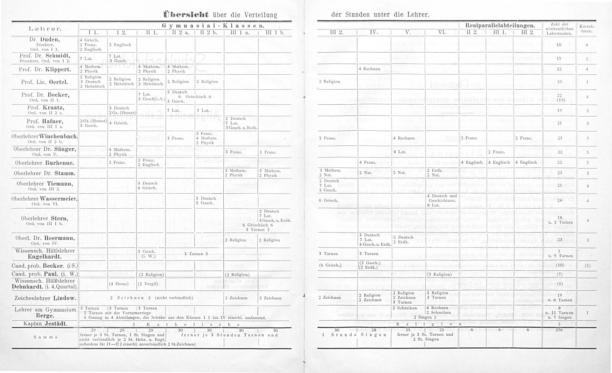 5——————— Gymnasial-KlIassen.[Realparallelabteilungen. Lahl der Korrek- Lehrer. wöchentlichen ture 1. 1 1. 1I 2. 1I1.1. II 2 a. lII 2 b. I. III. 1 a. I III 1. b.. le l. vlI lI2 IHI L. III Z2[fehrstunden.] turen. Dr. Duden, 4 Griech. 1 K f— Direktor, 2 Franz. 2 Englisch 10 4 Ord. von I 1. 2 Englisch V Prof. Dr. Schmidt, 7 Lat . 2 at. Prorektor, Ord. von I 2. 7 Lat. 3 Gesch. 17 2 p 71. 4 Mathem.— Mathem. 1 Mathem. Prof. Dr. Klippert. 2 physik 2 Physik 2 Physik. 4 Bechnen 22 4 2 Religion 453 . 8 2 Religion[2 Religio.*. 1.:4 Prof. Lic. Oertel. 3 Deutsch 2 Hioi.atadh 2 deaath 2 Religion[2 KReligion 2 Religion 21 1 2 Hebräisch 1 — — 4 3 Deutsch Prof. Dr. Becker, Tat.. 6 t. e heen 6 4 22 4 Ord. von II 1. 3 Gesch(i. S.) 3 Gesch.(19) Prof. Kraatz, 3 Deutsch' Ord. von II 2 a. 2 Gr.(Homer) 7 Lat. 7 Lat. 19 3 2 Deutsch Prof. Hafner, 27 Qiomei) 4 Griech. 7 Tat. 21 3 Ord. von III 1 a. Gekh.— 3 Gesch. u. Erdk. ; 3 Franz. Oberlehrer Winchenbach, 3 Franz. 4 Mathem.. 3 Franz. 4 Rechnen 2 Franz. 2 Franz. 23 7 Ord. von II 2 b. 2 Physik Oberlehrer Dr. Sänger, 4 Mathem.. 1 Ord. von V. 2 Physik 3 Prän. 3 Kran⸗. 8 L at. 2 PrAn2. 22 5 Oberlehrer Burhenne. 2 Franz. 2 Waack— 4 Franz. 3 Englisch 4 Englisch 4 Englisch 22 27 3 Mathem. 3 Mathem. 3 Mathem.. 1 2 Erdk. Oberlehrer Dr. Stamm. 2 Physik 2 Physik 2 Mat. 2 Nat. 2 Nat. 2 Mra 23 . 2 Deutscl Oberlehrer Tiemann, 3 Deutsch 7 Lat, a 21 4 Ord. von III 2. 6 Griech. 3 Gesch. .— b 4 Deutsch und Oberlehrer Wassermeier, 3 Peutsed 6 Griech. Geschichtserz. 24 V 4 Ord. von VI.— zesch..— 8 Lat. 1 2 Deutsch 1 7 Lat. p Oberlehrer Stern, 3 Gesch. u. Erdk. 3 5 4 Ord. von III 1 b. 6 Griechisch 6 V u. urnen V 3 Turnen 3 3 Deutsch Oberl. Dr. Heermann, V 2 Religion 2 Religion„ Lad 3 Vecsesr 24 5 Ord. von IV. 4 Gesch. u. Erdk. ² Erdk. Wissensch. Hülfslehrer 3 Gesch. 3 Engelhardt.(i. W) 3 Turnen 3 9 3 Turnen 3 Turnen u. 9 Turnen .: 2 Gesch. Cand. prob. Becker.(iS.) V(6 Griech.) zee 110) 11) Cand. prob. Paul.(i. W.)(2 Religion)(2 Religion)(3 Religion)(7) Wissensch. Hülfslehrer . 4 Hora⸗ 2 Vergil 6 Dehnhardt.(i. 4. Quartal). G Hore)(e Nergil) G 14 2 Religion 2 Religion 3 Religion 19 Zeichenlehrer Lindow. 2 Zeichnen 2(nicht verbindlich) 2 Zeichnen 2 Zeichnen 2 Zeichnen 2 zedlhn 2 Zeichnen 3 Turnen u. 6. Turnen f 3 Turnen 9 . 7 j[3 Turnen[3 Turnen[3 Turnen 2 Schreiben 4 Rechnen 8 Lehrer Be Gymnasium 2 Turnen mit der Vorturnerriege 2 Schreiben u. 11 Turn en 1 erge. 5 Gesang in 4 Abteilungen, die Schüler aus den Klassen 1 1 bis IV einschl. umfassend. 2 Singen 2 u. 7 Singen Kaplan Jestädt. 5 Ka t ele—— 5 29 29 29 30 U 30 30 D 30 30 28 25 D 25 6 6 6 376 S8 u m m a ferner je 3 St. Turnen, 1 St. Singen und ferner je 3 Stunden Turnen und 1 Stuncde Singen ſerner je 3 St. Turnen und 3 nicht verbindlich je 2 St. Hebr. u. Engl.. 2 St. Singen außerdem für I1— II 2 einschl. unverbindlich 2 St. Zeichnen V