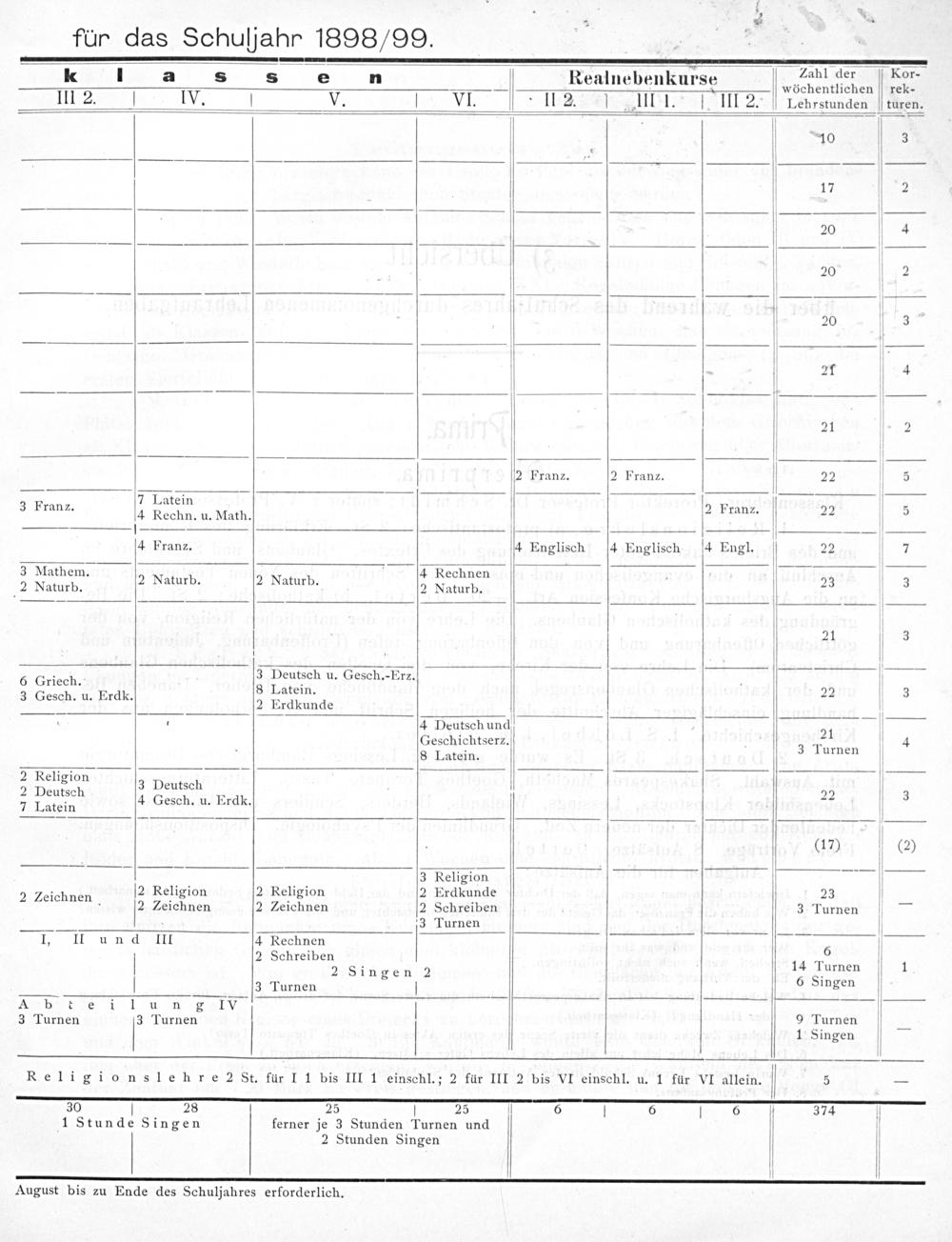 ———————ꝛʒ——— k l a s8 s en Realnebenkurse Zahl der Kor- — 4 wöchentlichen rek- III2. IV. V. VI. II2. IIII. III 2. Lehrstunden turen. 0 3 17 2 20 4 20 2 20 3 21 4 21 2 2 Franz. 2 Franz. 22 3 7 Latein. 3 3 Pran⸗. 4 Rechn. u. Math. 2 PrAui⸗ 22 5 D 1 4 Franz. 4 Englisch 4 Englischh 4 Engl. 22 7 — 3 Mathem. 4 Rechnen. 2 Naturb. 2 Naturb. 2 Naturb. 2 Naturb. 23 3 21 3 ; 3 Deutsch u. Gesch.-Erz. 6 Griech.... 4 8 Latein. 22 1 3 3 Gesch. u. Erdk. 2 Erdkunde 1 4 Deutsch und 21 Geschichtserz. 3 Turnen 4 8 Latein. 2 Religion 2 Deutsch 4, Deutben n 22 3 7 Latein esch. u. Erdk. 41„7(0) 3 Religion ; 2 Religion 2 Religion 2 Erdkunde 23 2 Leichnen 2 Zeichnen 2 Leichnen 2 Schreiben 3 Turnen— . 3 Turnen I, H un d III 4 Rechnen 6 2 Schreiben„ . 14 Turnen 1 2 Singen 2 6 Singe 3 Turnen ingen Abt el l un 2 1 3 Turnen 3 Turnen 9 Turnen V 1 Singen Religionslehre 2 St. für I 1 bis III 1 einschl.; 2 für III 2 bis VI einschl. u. 1 für VI allein. 5— 55 S S V ſ 5 5— 377 ſ 1 Stunde Singen ferner je 3 Stunden Turnen und 2 Stunden Singen V